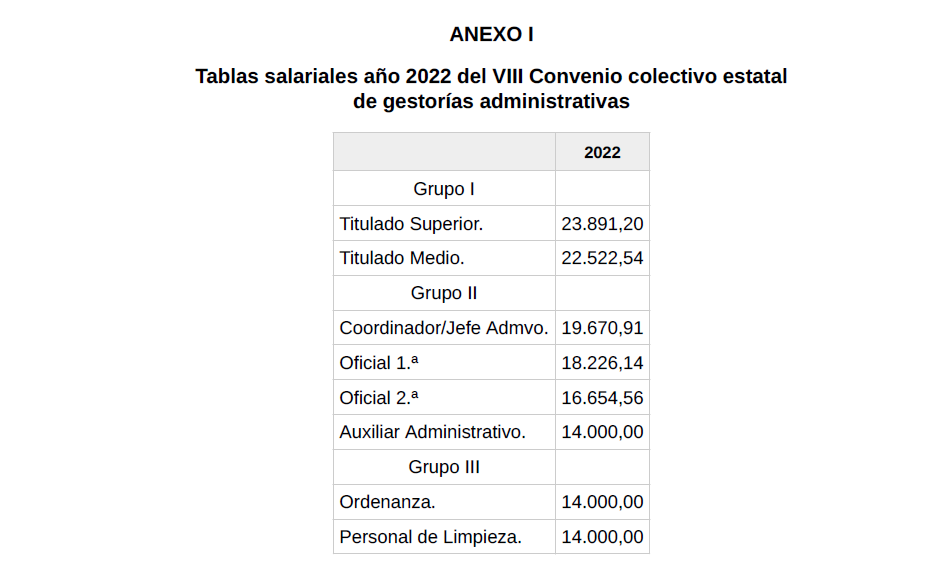 A tal fin, junto a las tablas salariales y en el artículo 24 de este convenio, figura el porcentaje de incremento contenido en las mismas con respecto al salario del año inmediatamente anterior, siendo que para el 2024 el porcentaje de incremento es del 4% sobre las tablas salariales publicadas en el BOE núm. 68/2023, de 21 de marzo de 2023 y con excepción de los subgrupos de auxiliar administrativo/a del grupo II, auxiliar o ayudante/a técnico/a del grupo III y el personal del grupo IV que ven adecuados sus salarios a lo establecido para el SMI vigente.