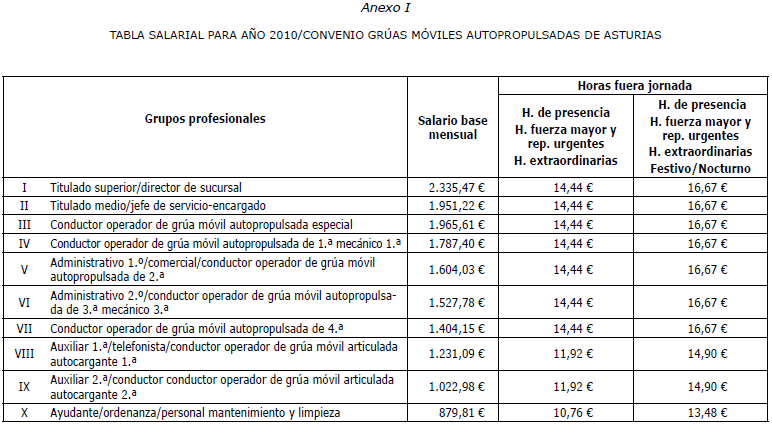 Visto el escrito de la Comisión Paritaria del Convenio Colectivo del sector (expediente C-37/07, código 3304255) Grúas Móviles Autopropulsadas del Principado de Asturias, recibido en el Registro de la Consejería de Industria y Empleo el 30-4-10 en la que se acuerda la revisión de las tablas salariales para el año 2010, y de conformidad con lo dispuesto en el art. 90, números 2 y 3 del Real Decreto Legislativo 1/1995, de 24 de marzo, por el que se aprueba el texto refundido de la Ley del Estatuto de los Trabajadores y Real Decreto 1040/1981, de 22 de mayo, sobre registro y depósito de Convenios Colectivos de trabajo, en uso de las facultades conferidas por Resolución de 3-9-07, por la que se delegan competencias del titular de la Consejería de Industria y Empleo en el titular de la Dirección General de Trabajo y Empleo, por la presente,
