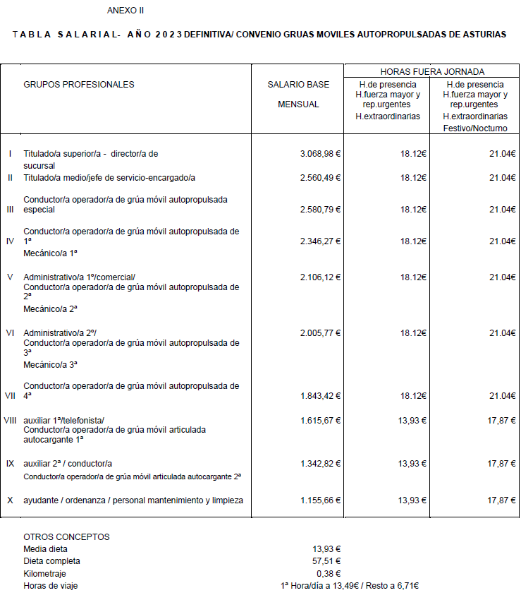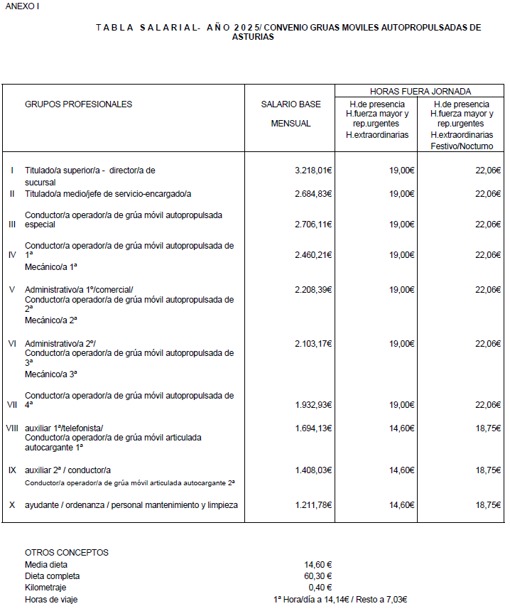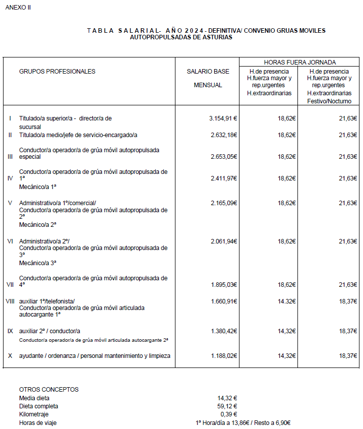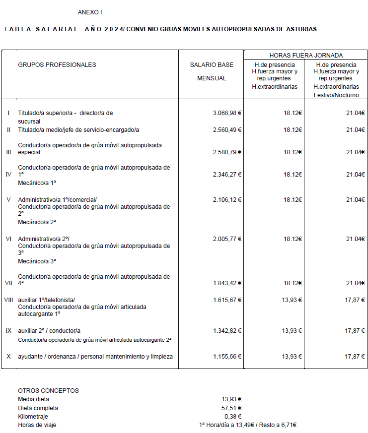 Resolución de 12 de febrero de 2025, de la Consejería de Ciencia, Empresas, Formación y Empleo, por la que se ordena la inscripción y publicación de la tabla salarial para el año 2024 del Convenio colectivo de sector Grúas Móviles Autopropulsadas de Asturias, en el Registro de convenios colectivos, acuerdos colectivos de trabajo y planes de igualdad de la Dirección General de Empleo y Asuntos Laborales.