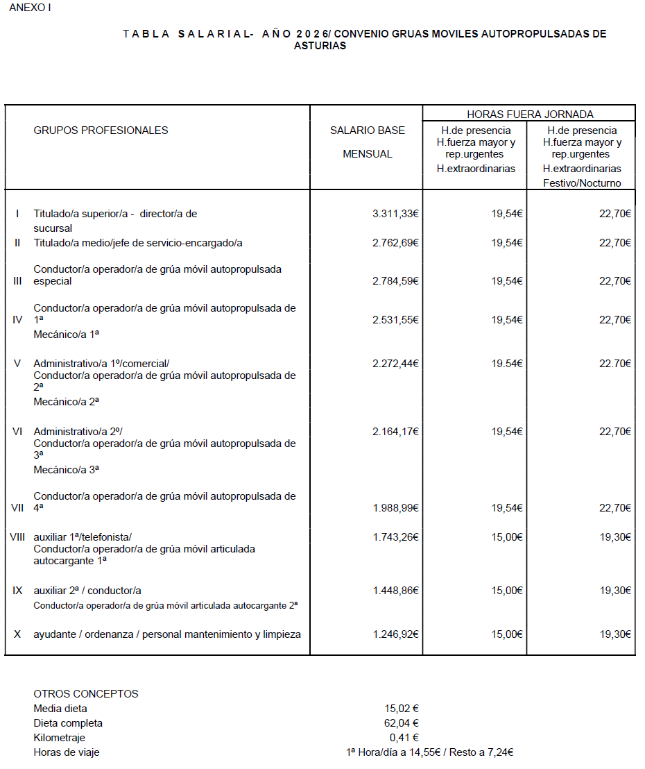 Resolución de 18 de febrero de 2026, de la Consejería de Ciencia, Industria y Empleo, por la que se ordena la inscripción y publicación de la tabla salarial definitiva para el año 2025 y la provisional para 2026, del convenio colectivo del sector de Grúas Móviles Autopropulsadas de Asturias, en el Registro de convenios colectivos, acuerdos colectivos de trabajo y planes de igualdad de la Dirección General de Empleo y Asuntos Laborales.
