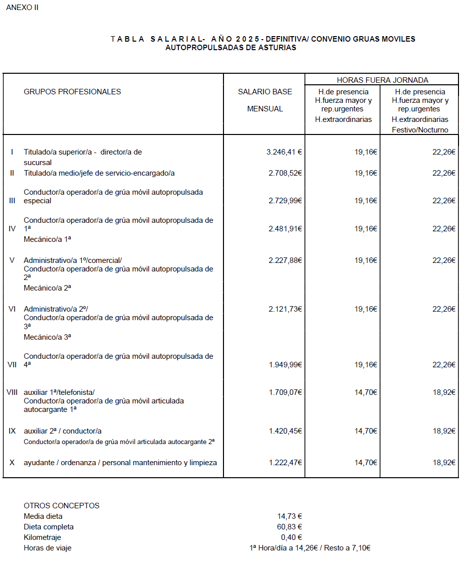 Visto el acta de la Comisión Paritaria del convenio colectivo de sector Grúas Móviles Autopropulsadas de Asturias (expediente C-034/2007, código 33004255012007), recibido a través de medios electrónicos ante el Registro de convenios colectivos, acuerdos colectivos de trabajo y planes de igualdad del Principado de Asturias el 16 de febrero de 2026, en la que se acuerda la tabla salarial definitiva para el año 2025 y la provisional para 2026, y de conformidad con lo dispuesto en el art. 90, números 2 y 3 del Real Decreto Legislativo 2/2015, de 23 de octubre, por el que se aprueba el texto refundido de la Ley del Estatuto de los Trabajadores y en el Real Decreto 713/2010, de 28 de mayo, sobre registro y depósito de convenios colectivos, acuerdos colectivos de trabajo y planes de igualdad, en uso de las facultades conferidas por Resolución de 19 de mayo de 2025, por la que se delegan competencias del titular de la Consejería de Ciencia, Industria y Empleo en la persona titular de la Dirección General de Empleo y Asuntos Laborales, por la presente,