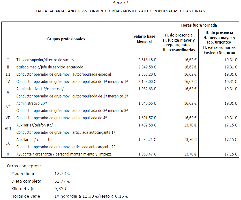Resolución de 22 de abril de 2022, de la Consejería de Industria, Empleo y Promoción Económica, por la que se ordena la inscripción de la tabla salarial para el año 2022 del convenio colectivo de la empresa Grúas Móviles Autopropulsadas de Asturias, en el Registro de convenios colectivos, acuerdos colectivos de trabajo y planes de igualdad de la Dirección General de Empleo y Formación.
