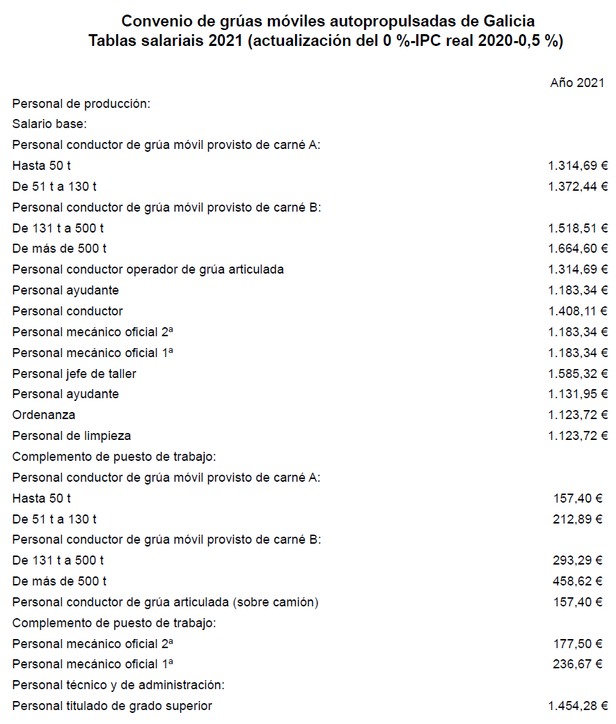 Se reúne la comisión paritaria al efecto de actualizar las tablas salariales del convenio colectivo de grúas autopropulsadas de Galicia del año 2020. Después de las oportunas deliberaciones y debate sobre la cuestión objeto de la reunión, esta comisión paritaria acuerda: