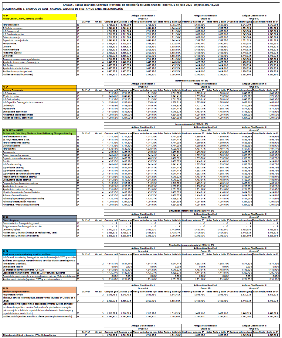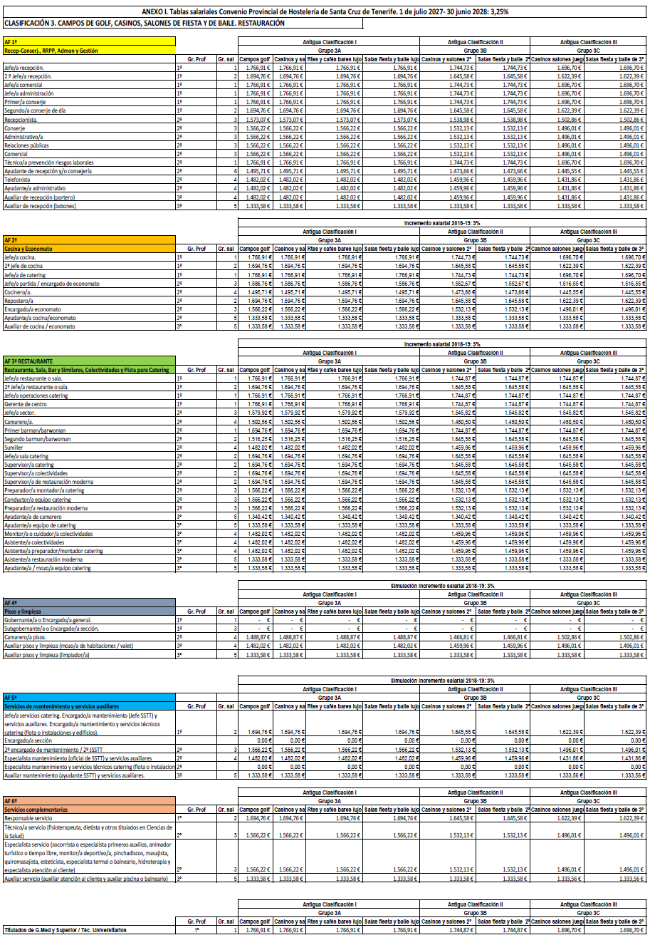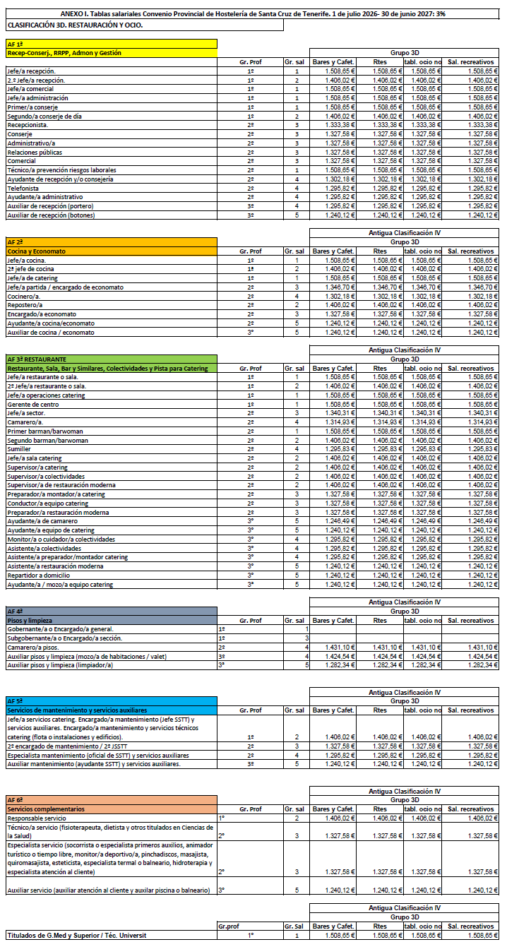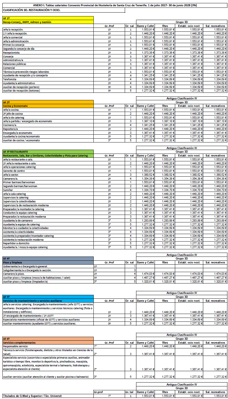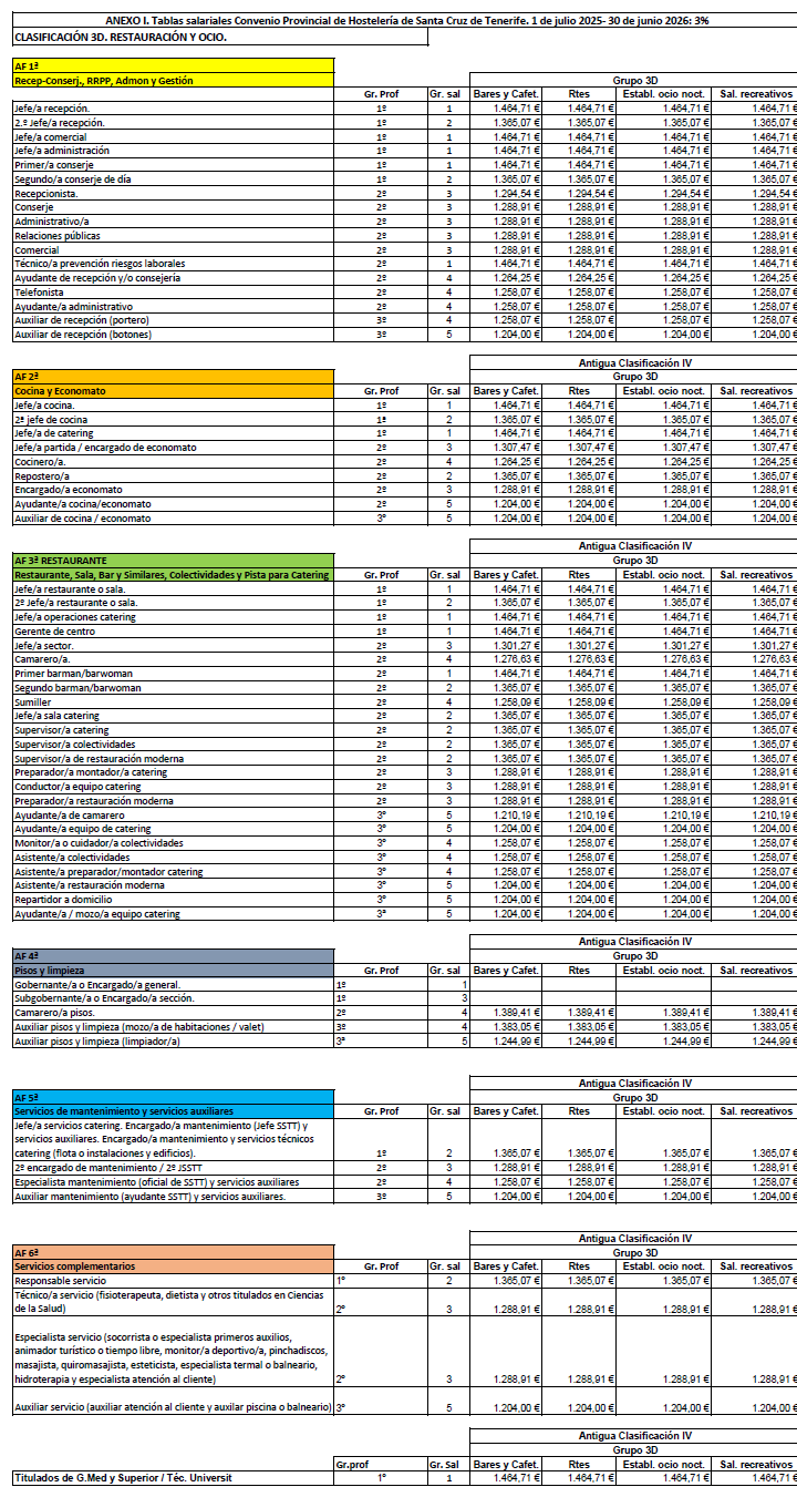 La retribución del personal que presta servicios en el subsector de Restauración y Ocio será la establecida en las tablas salariales del Anexo I (Clasificación 3ªD) para cada periodo comprendido entre el 1 de julio de un año al 30 de junio del siguiente durante los tres años de vigencia del convenio. Las retribuciones pactadas tienen incrementado el 3% para cada periodo. Las tablas de retribuciones estarán sujeta a la misma cláusula de revisión respecto al IPC de la provincia de Santa Cruz de Tenerife establecida en el artículo 7.4 del presente Convenio.