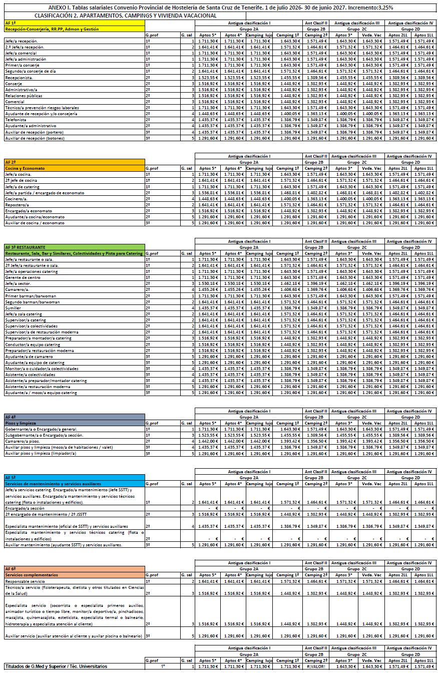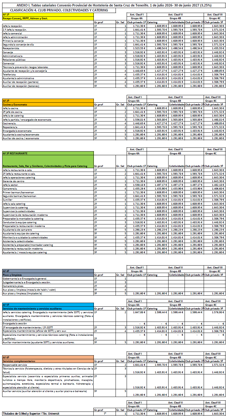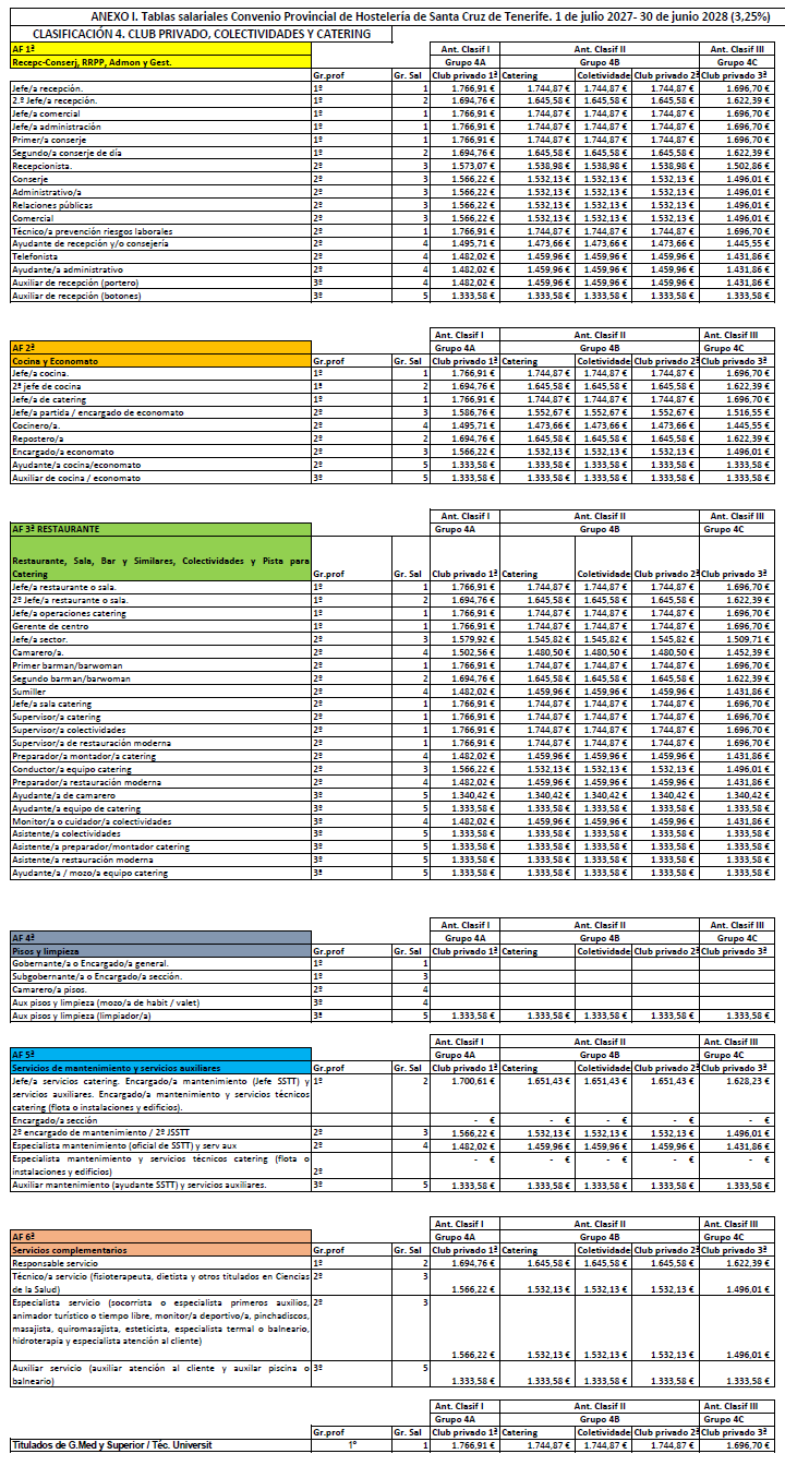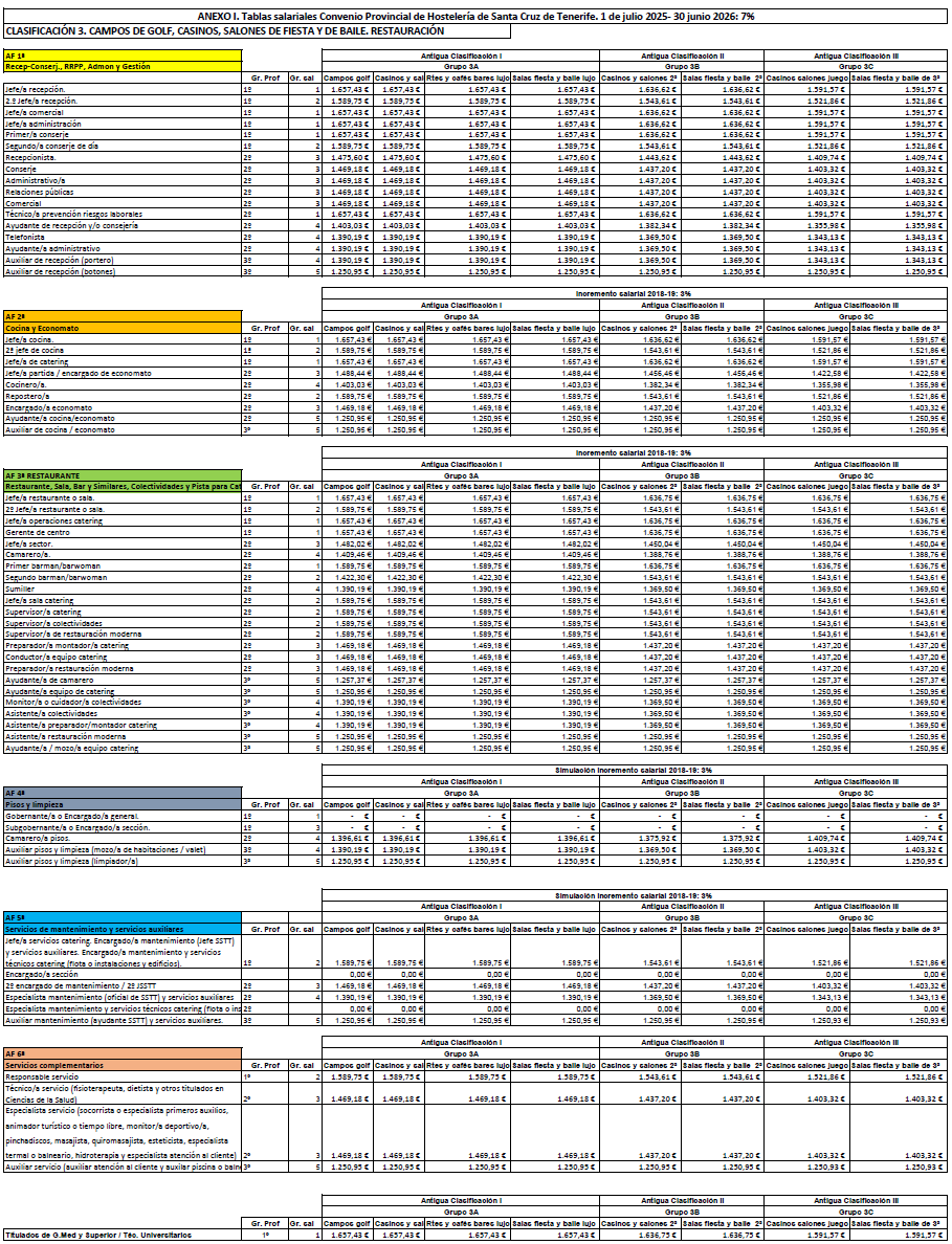 La retribución del personal que presta servicios en el subsector de Restauración y Ocio será la establecida en las tablas salariales del Anexo I (Clasificación 3ªD) para cada periodo comprendido entre el 1 de julio de un año al 30 de junio del siguiente durante los tres años de vigencia del convenio. Las retribuciones pactadas tienen incrementado el 3% para cada periodo. Las tablas de retribuciones estarán sujeta a la misma cláusula de revisión respecto al IPC de la provincia de Santa Cruz de Tenerife establecida en el artículo 7.4 del presente Convenio.