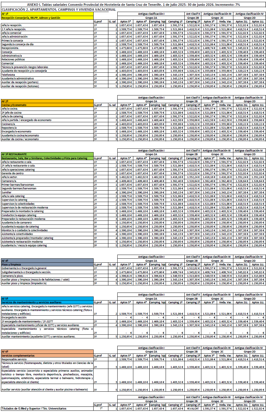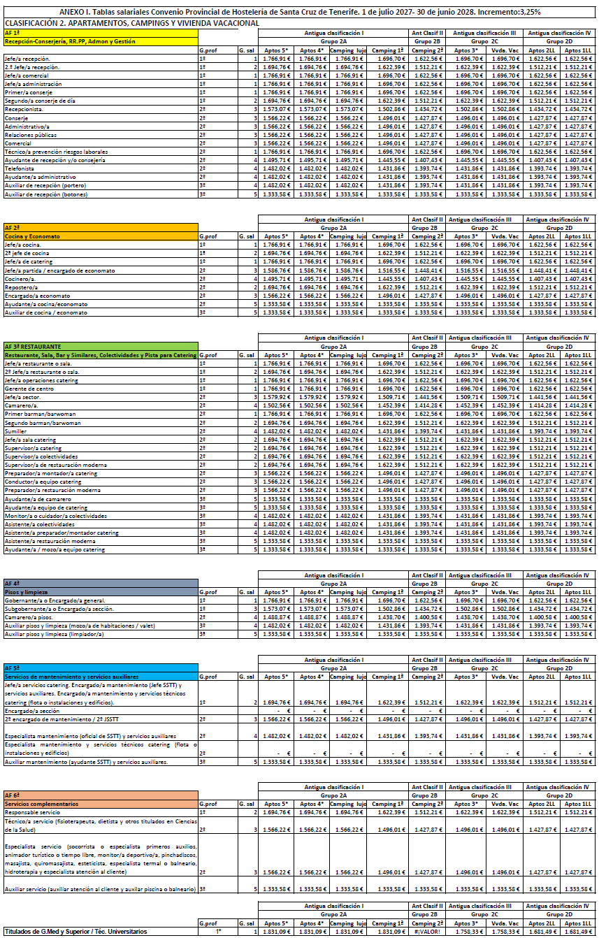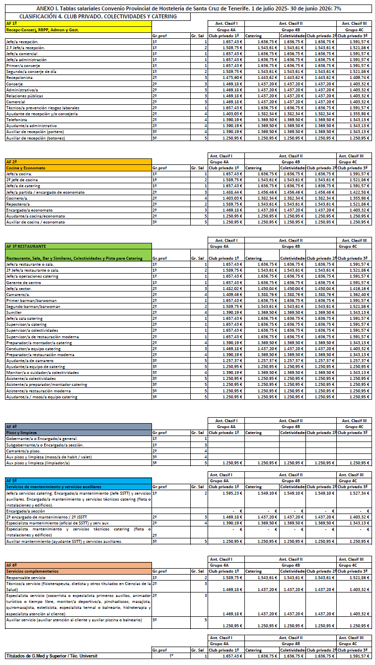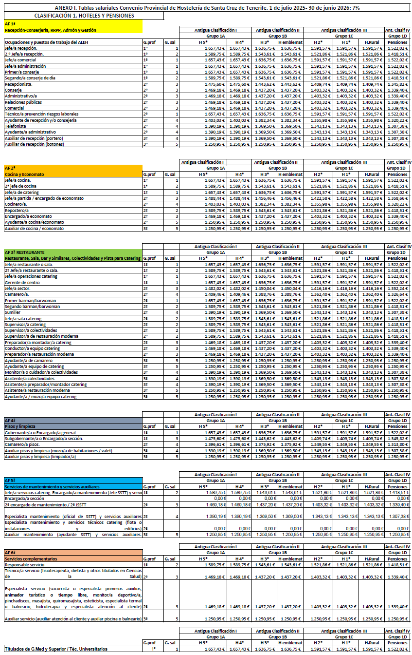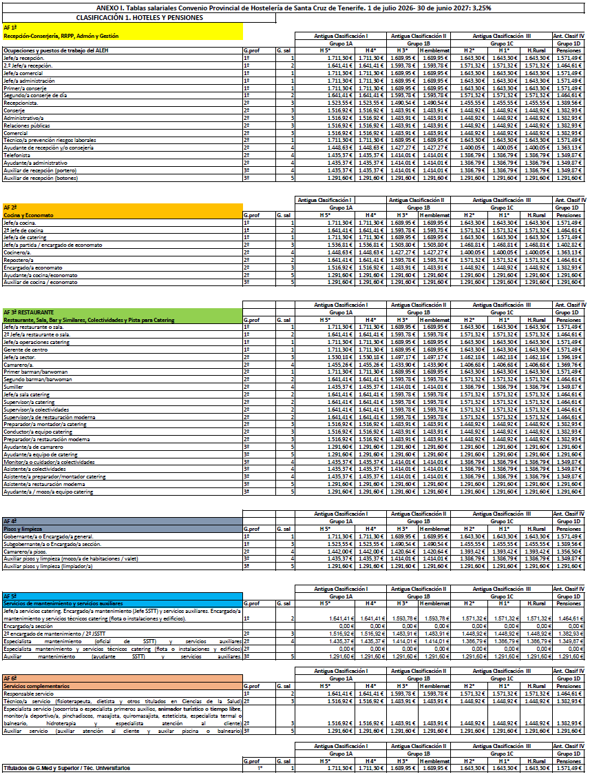 La retribución del personal que presta servicios en el subsector de Restauración y Ocio será la establecida en las tablas salariales del Anexo I (Clasificación 3ªD) para cada periodo comprendido entre el 1 de julio de un año al 30 de junio del siguiente durante los tres años de vigencia del convenio. Las retribuciones pactadas tienen incrementado el 3% para cada periodo. Las tablas de retribuciones estarán sujeta a la misma cláusula de revisión respecto al IPC de la provincia de Santa Cruz de Tenerife establecida en el artículo 7.4 del presente Convenio.