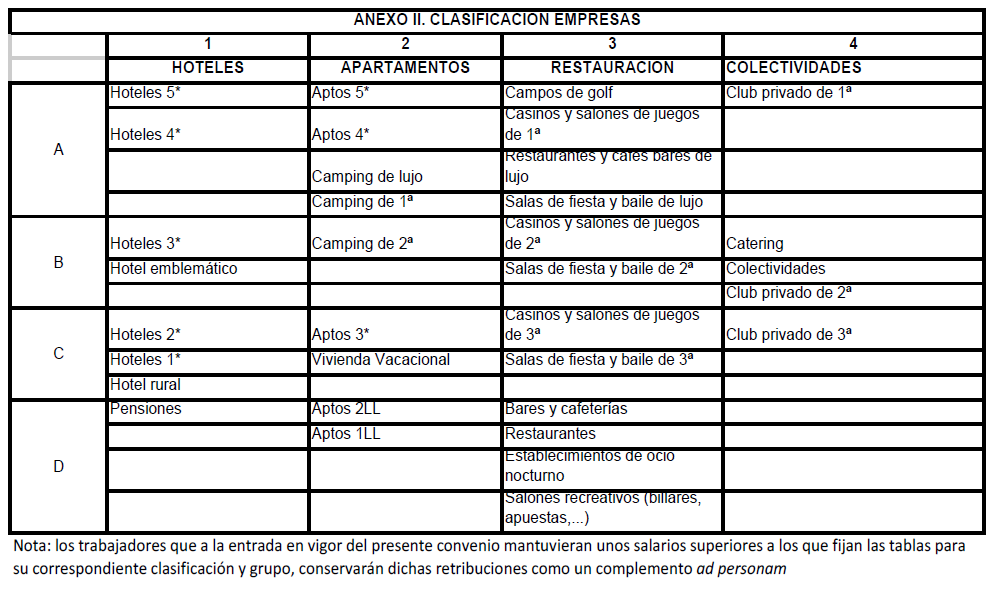 Se incluyen en el sector de la Hostelería todas las empresas que, independientemente de su titularidad y fines perseguidos, realicen en instalaciones fijas o móviles, y tanto de manera permanente como ocasional, actividades de alojamiento en hoteles, hostales, residencias y apartamentos que presten algún servicio hostelero, albergues, pensiones, moteles, alojamientos rurales, campings y todos aquellos establecimientos que presten servicios de hospedaje en general, así como aquellos otros que determine la normativa turística canaria. Asimismo, se incluyen las empresas que presten servicios de productos listos para su consumo, tales como restaurantes, establecimientos de catering, colectividades, de comida rápida, pizzerías, hamburgueserías, creperías, etc., y cafés, bares, cafeterías, cervecerías, heladerías, chocolaterías, degustaciones, salones de té y similares, además de las salas de baile o discotecas y locales de ocio nocturno, cafés-teatro, tablaos y similares, así como los servicios de comidas y/o bebidas en casinos, bingos, billares y salones recreativos, residencias geriátricas, piscinas, campos de golf y clubes privados.