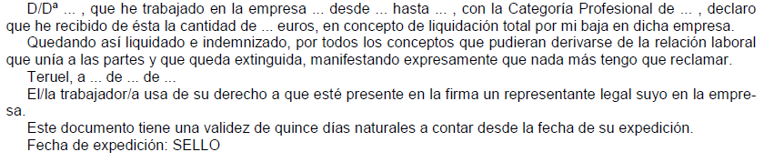 El recibo de finiquito de la relación laboral entre empresa y persona trabajadora deberá ser conforme al modelo que figura como Anexo IV del presente Convenio o cualquier otro que recoja los mismos conceptos que en el mismo se reflejan.
