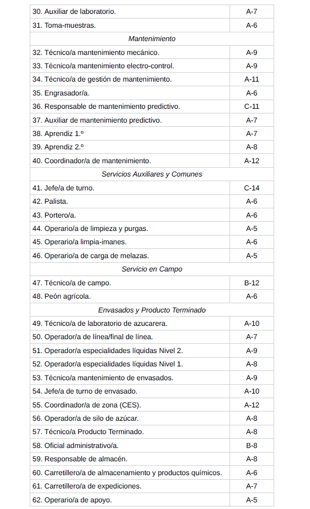 – Mandos intermedios (Jefe de cada uno de los servicios mecánico, eléctrico, automatismos, y Contramaestre, en azucareras).