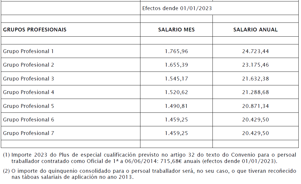 Os salarios para os distintos grupos profesionais, para o período que vai dende o 1 de xaneiro ao 31 de decembro de 2023, serán os recollidos na táboa salarial da anualidade 2023 que se adxunta ao presente Convenio como Anexo III, resultado de aplicar incremento do 3,25% sobre os salarios da anualidade 2022. Ditos salarios será esixibles dende o 1 de xaneiro de 2023.