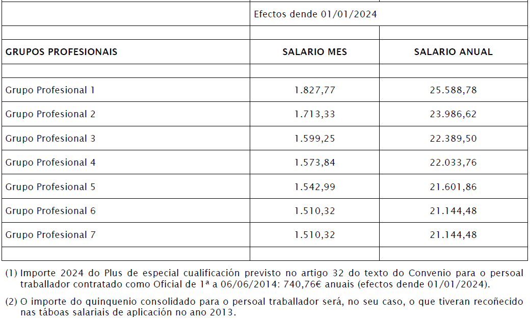 Os salarios para os distintos grupos profesionais, para o período que vai dende o 1 de xaneiro ao 31 de decembro de 2024, serán os recollidos na táboa salarial da anualidade 2024 que se adxunta ao presente Convenio como Anexo IV, resultado de aplicar incremento do 3,50% sobre os salarios da anualidade 2023. Ditos salarios será esixibles dende o 1 de xaneiro de 2024.
