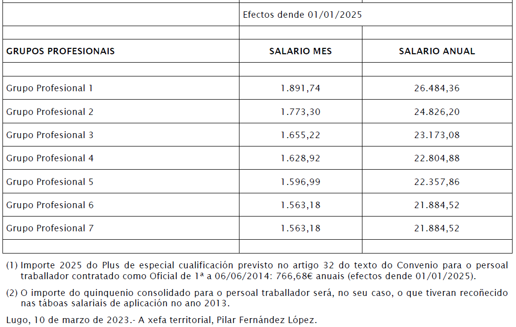 Os salarios para os distintos grupos profesionais, para o período que vai dende o 1 de xaneiro ao 31 de decembro de 2025, serán os recollidos na táboa salarial da anualidade 2025 que se adxunta ao presente Convenio como Anexo V, resultado de aplicar incremento do 3,50% sobre os salarios da anualidade 2024. Ditos salarios será esixibles dende o 1 de xaneiro de 2025.