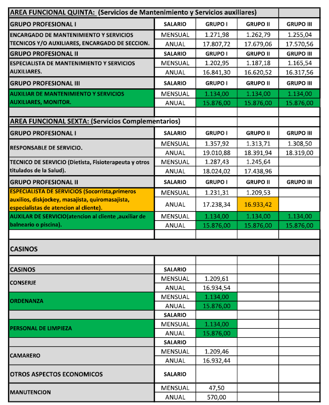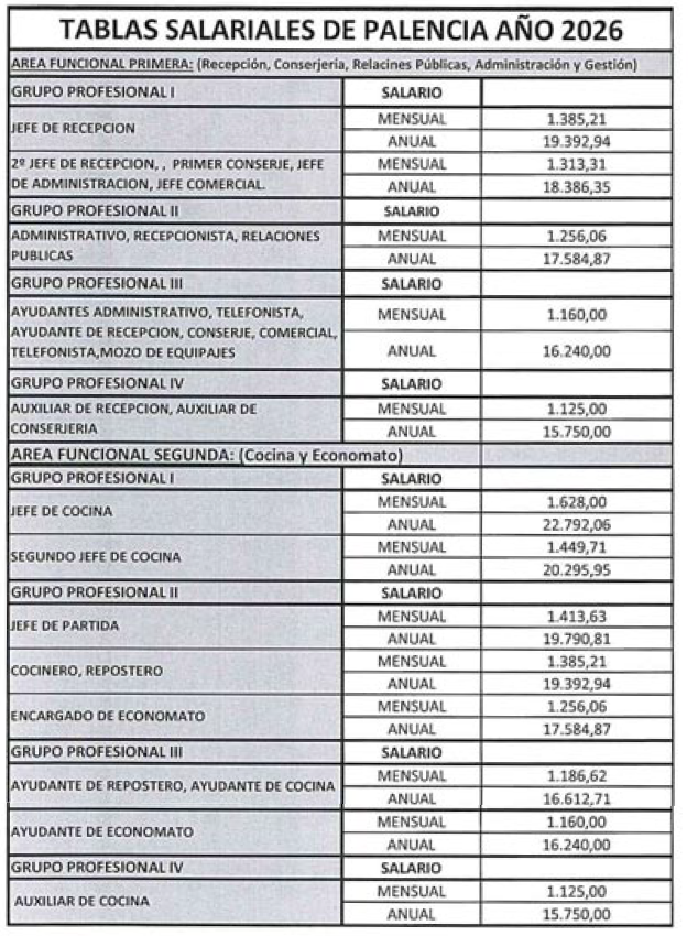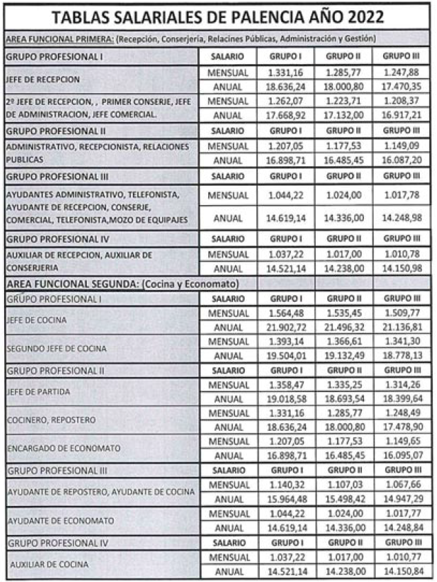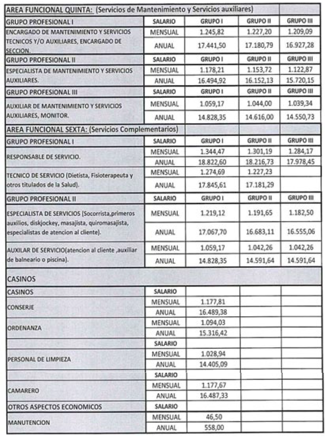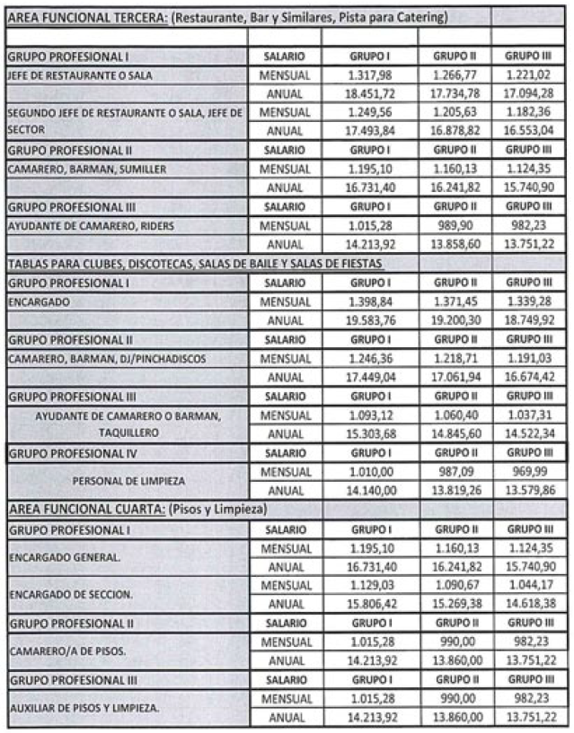 Los salarios establecidos en este convenio colectivo provincial se establecen de acuerdo a las 6 Áreas Funcionales existentes, hasta 4 Grupos Profesionales en cada una de ellas, las categorías profesionales, así como los Grupos de establecimientos (hasta cuatro), dependiendo de las categorías de los establecimientos de Hostelería que se señalan en el Anexo I de este convenio.