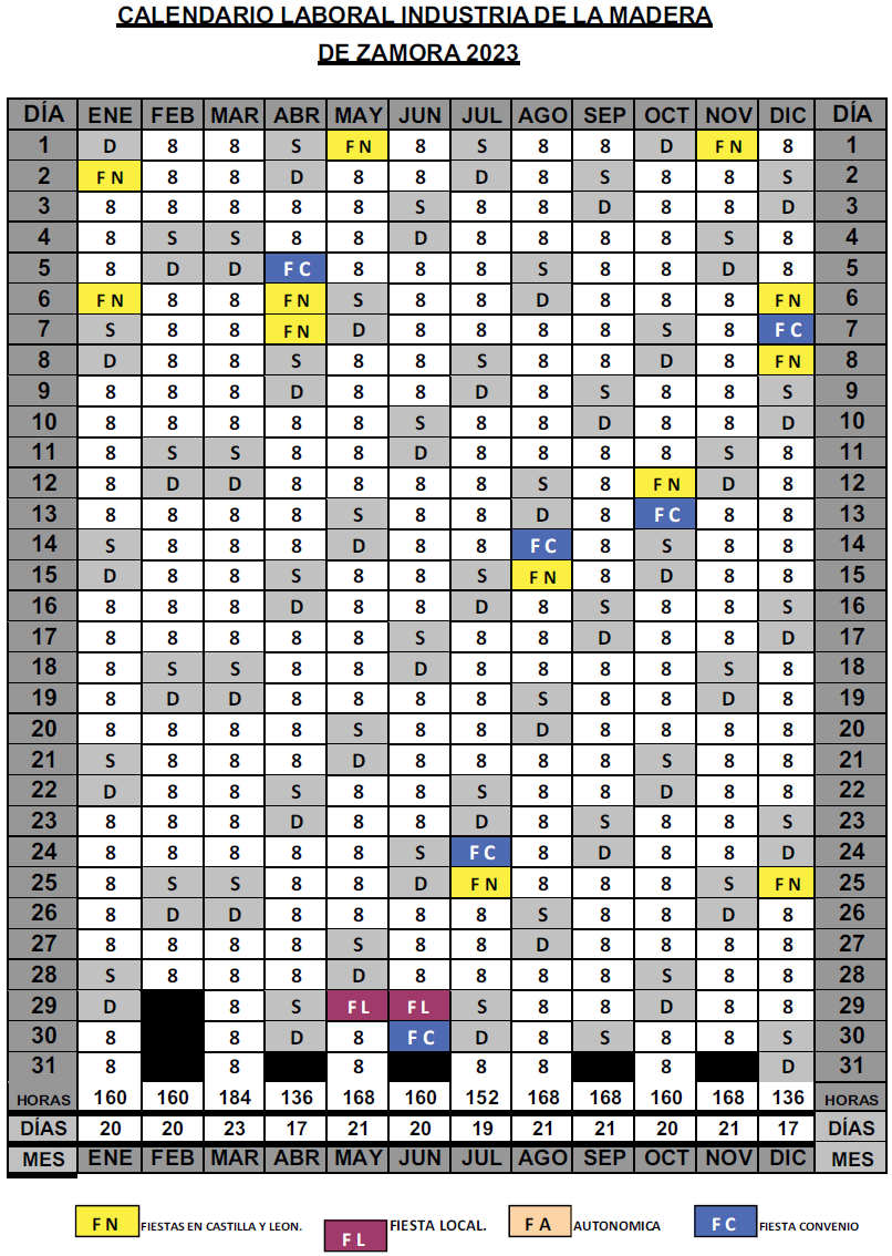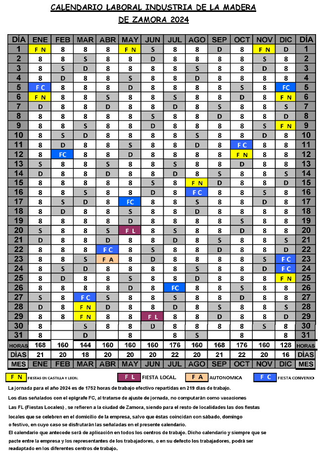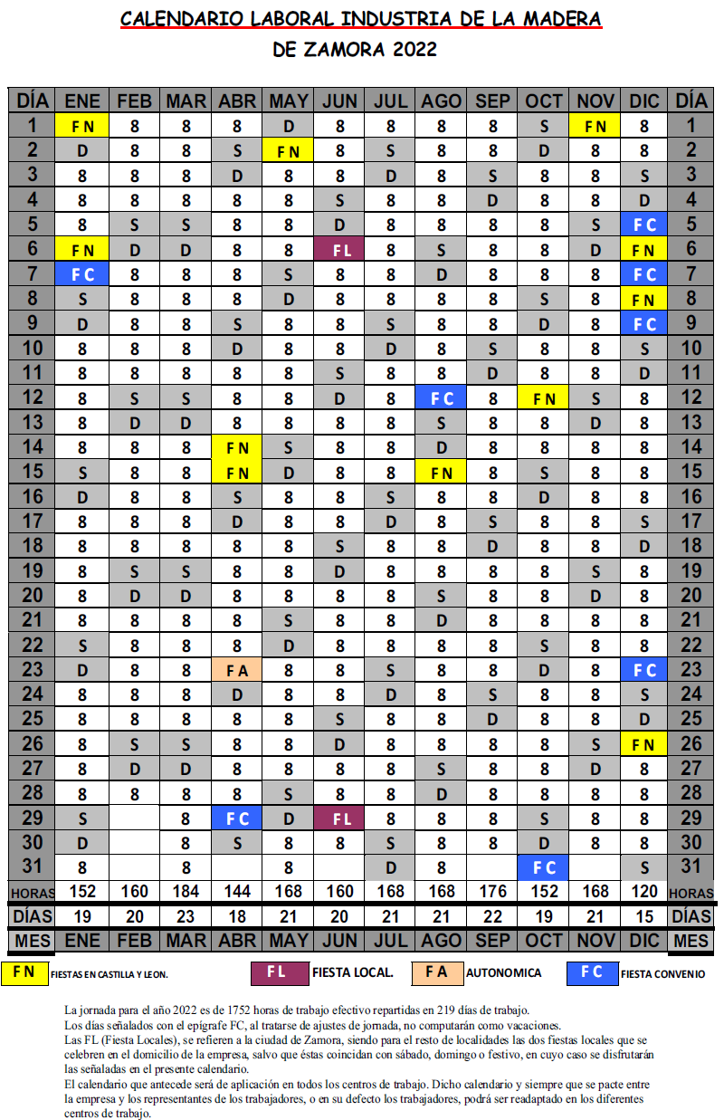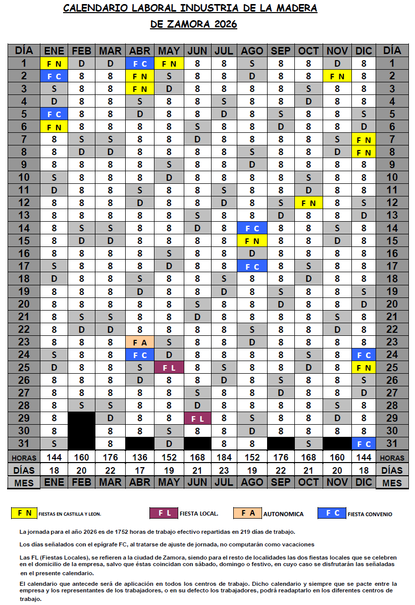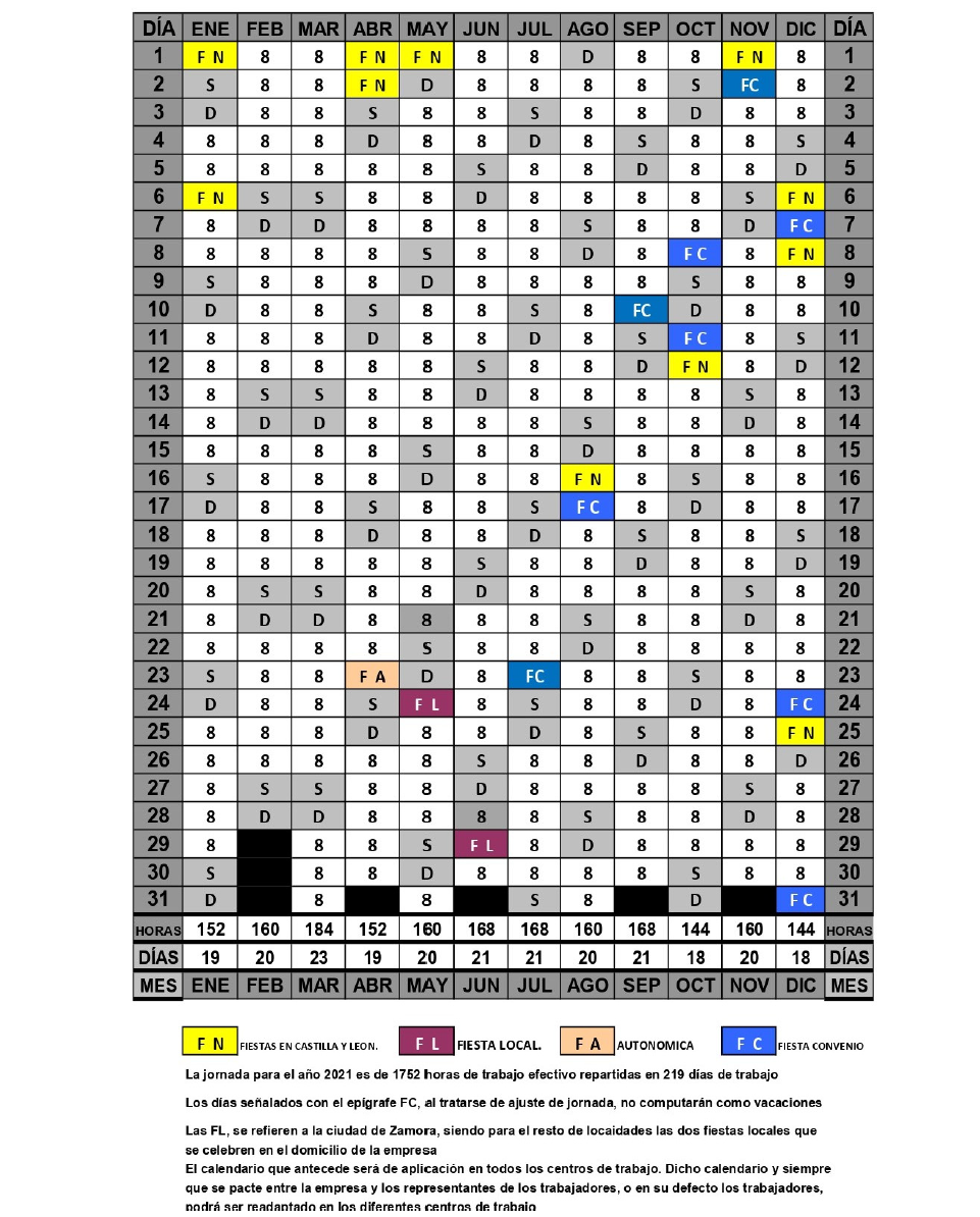 Las FL (Fiestas Locales), se refieren a la ciudad de Zamora, siendo para el resto de localidades los dos fiestas locales que se celebren en el domicilio de la empresa, salvo que éstas coincidan con sábado, domingo o festivo, en cuyo caso se disfrutarán las señaladas en el presente calendario.