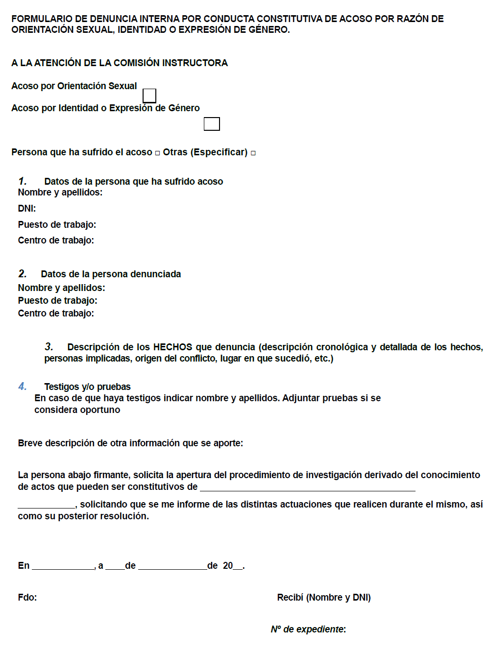 Cualquier persona trabajadora que considere que ha sido objeto de una situación de acoso o discriminación podrá presentar una queja verbal o por escrito ante: