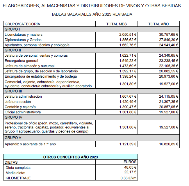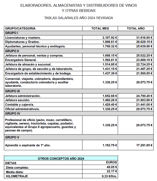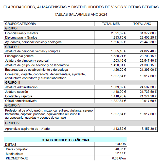 Resolución de 24 de enero de 2024 de la Oficina Territorial de Trabajo de Burgos, por la que se dispone la inscripción en el registro de convenios y acuerdos colectivos de trabajo y la publicación en el Boletín Oficial de la Provincia de Burgos de las tablas salariales para el año 2023 revisadas y las correspondientes al año 2024 del convenio colectivo para la industria elaboradora, almacenistas y distribuidores de vinos, cervezas, licores y otras bebidas espirituosas de la provincia de Burgos. (C.C. 09000395011981).