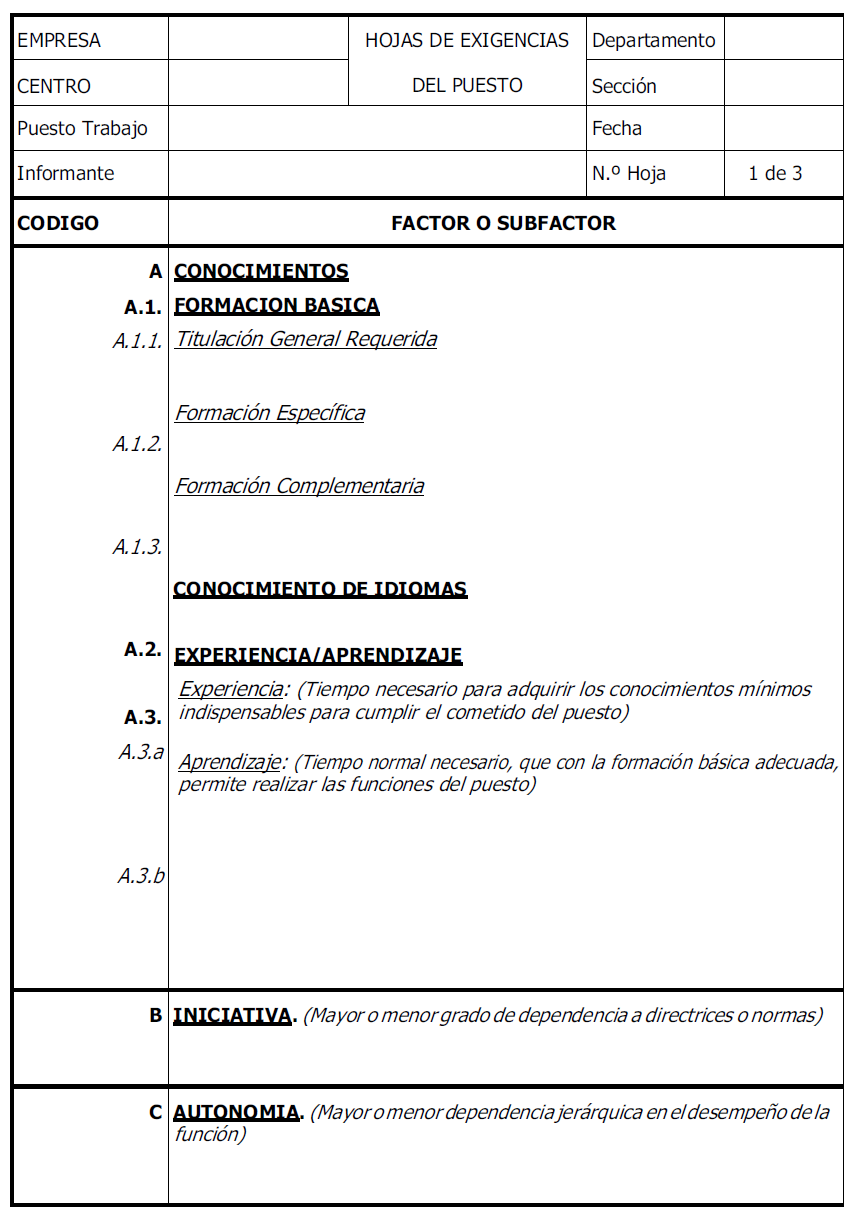 Este subfactor, considera el nivel inicial mínimo de conocimientos teóricos que, debe poseer una persona de capacidad media, para llegar a desempeñar, satisfactoriamente, las funciones del puesto de trabajo después de un periodo de adaptación. Este subfactor, también deberá considerar las exigencias de conocimientos específicos y complementarios.