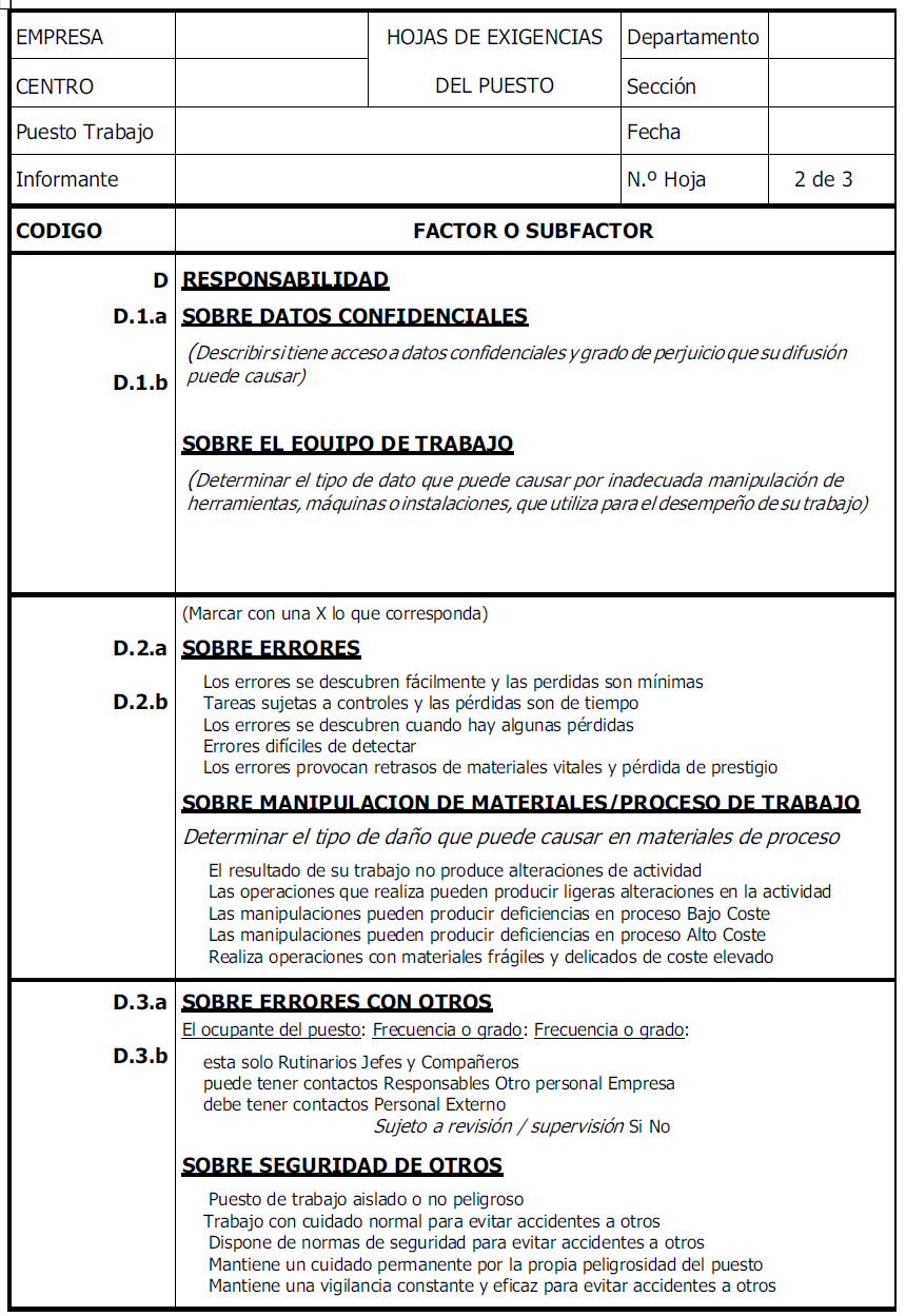 b) Habilidades especiales: Este subfactor determina las habilidades que se requieren para determinados trabajos, como pueden ser carga física, destreza manual, etc. y su frecuencia durante la jornada laboral.