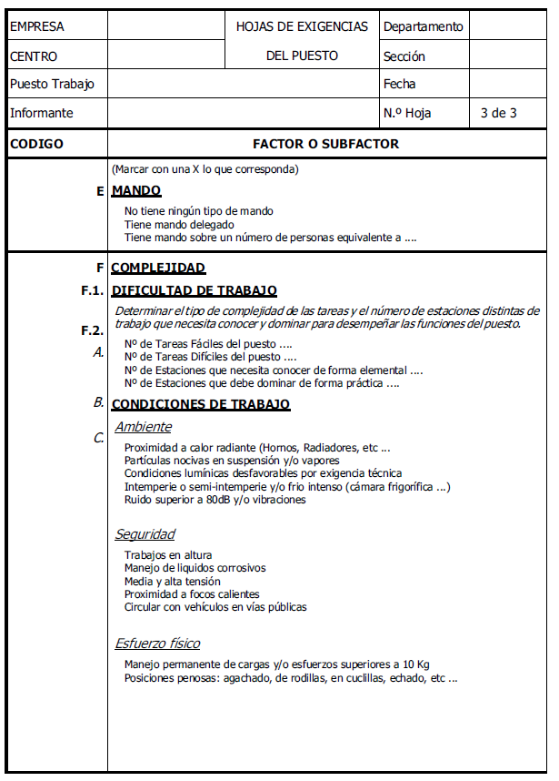 Factor cuya valoración estará en función de la mayor o menor dificultad de las tareas a realizar, así como del mayor o menor grado de integración del resto de los factores en la tarea o puesto encomendado. Así como del espacio y las condiciones en las que debe desarrollar las tareas del puesto encomendado.