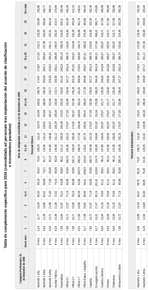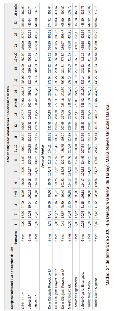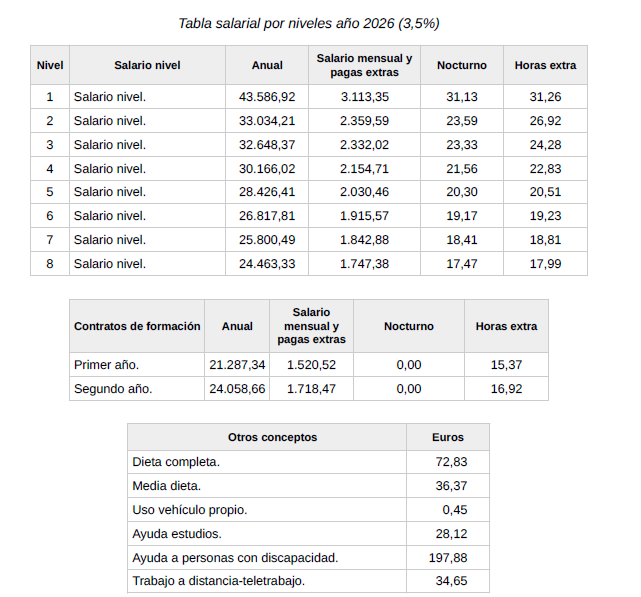 En base a lo establecido en el artículo 18 del vigente convenio colectivo, se procede a establecer como definitivas las tablas del año 2025 publicadas en fecha 19 de agosto de 2025 en el BOE, y se procede a firmar las tablas del año 2026 en base a la aplicación del 3,5 % sobre las tablas definitivas del año 2025 con efectos del 1 de enero de 2026.
