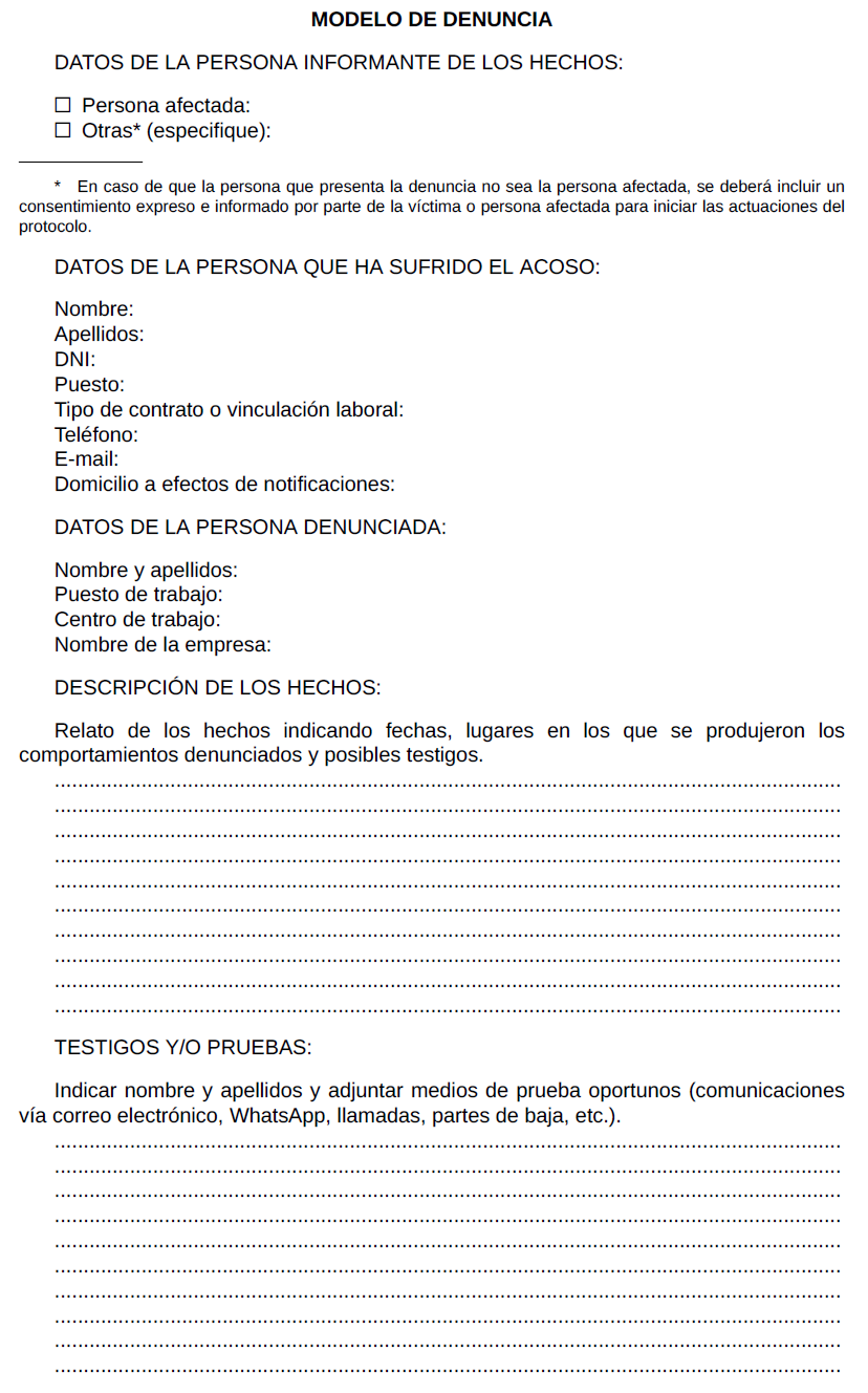 Se pone a disposición de las personas trabajadoras de la empresa el modelo que figura en este protocolo para la formalización de la denuncia o reclamación. La presentación de la denuncia o reclamación mediante el formulario correspondiente será necesaria para el inicio del procedimiento en los términos que consta en el apartado siguiente.