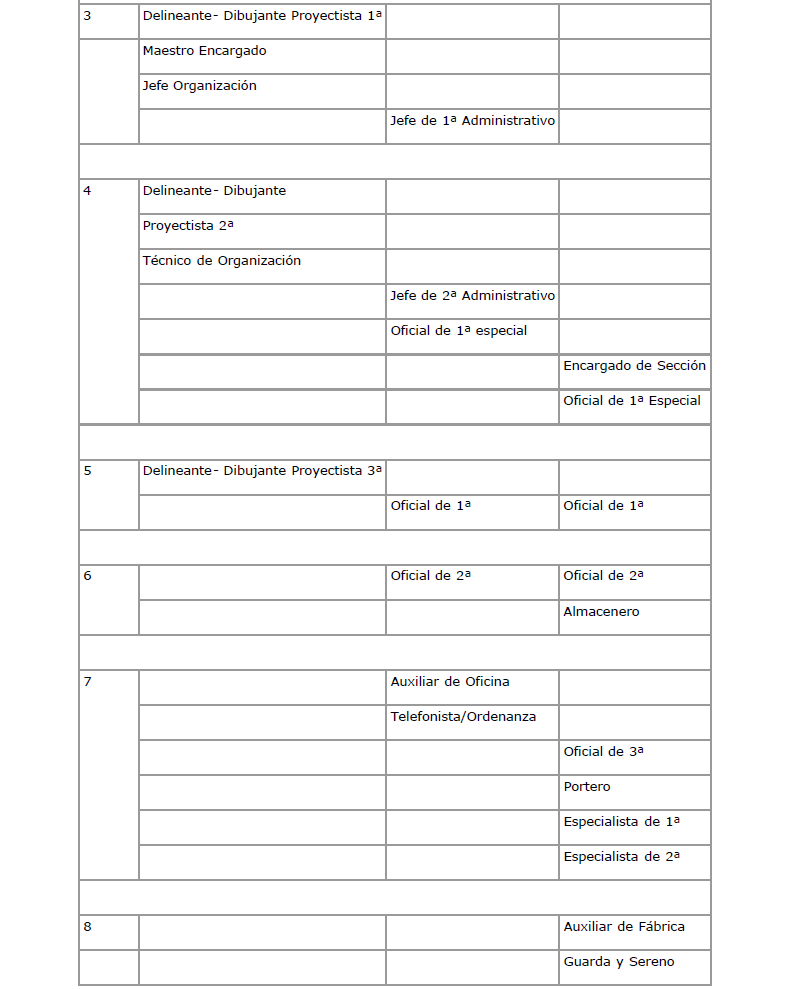 18.1.- La estructura de encuadramiento profesional del Convenio colectivo para la Industria Metalográfica de Catalunya consta de tres divisiones funcionales (Técnicos, Empleados y Operarios) que están subdivididos, a su vez, en ocho grupos. Por lo tanto, cada puesto, deberá ser adscrito a una división funcional, y a un determinado grupo, debiéndose de asignar el salario de grupo establecido para el mismo.
