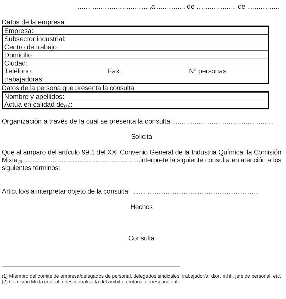 ANEXO III.- Modelo a rellenar para consultas a la Comisión Mixta del Convenio General de la Industria Química