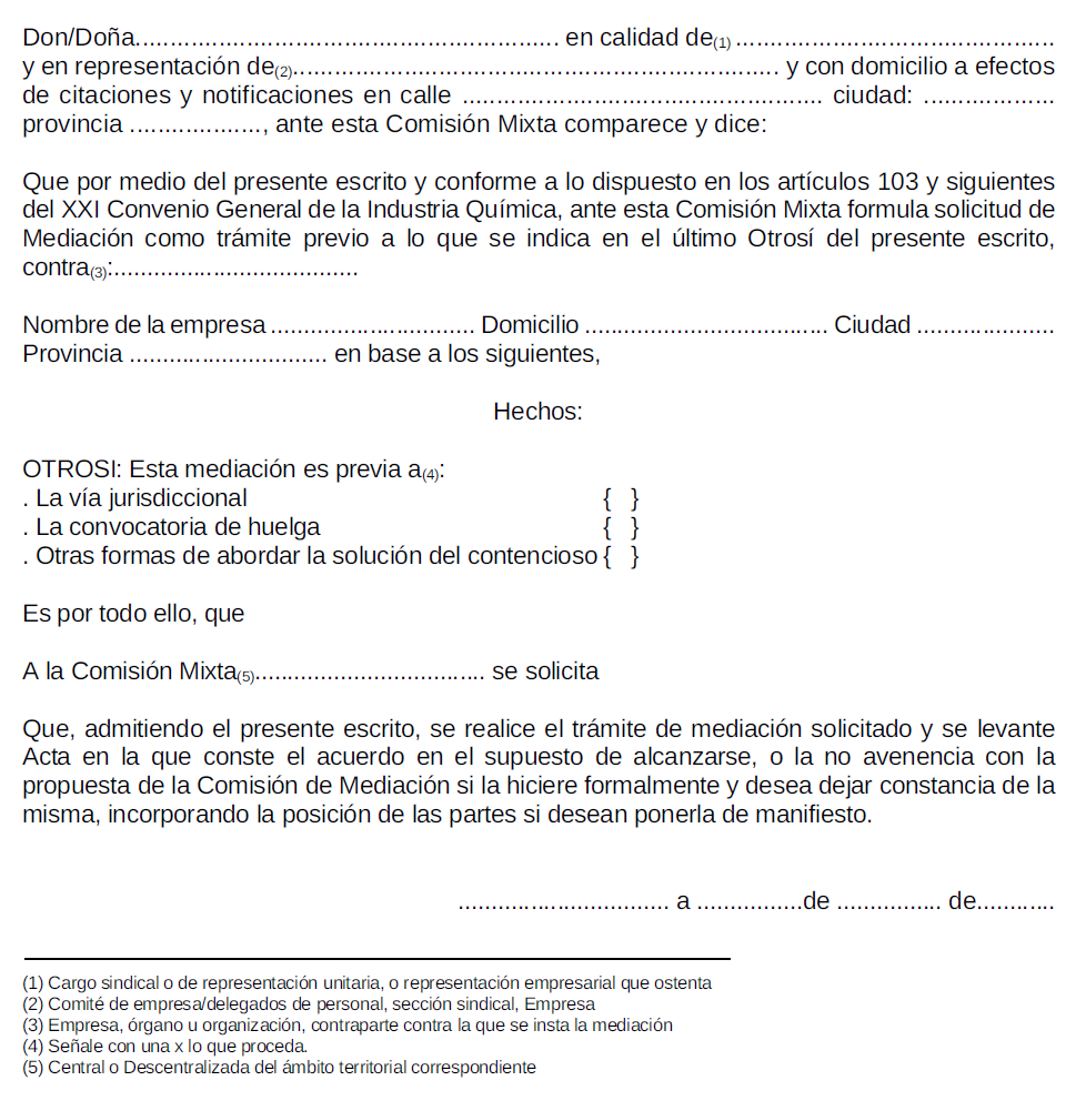 ANEXO IV.- Modelo a rellenar para solicitudes de mediación a la Comisión Mixta del Convenio General de la Industria Química
