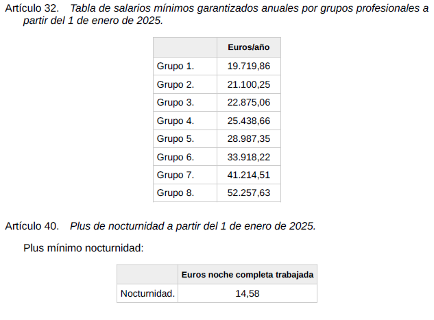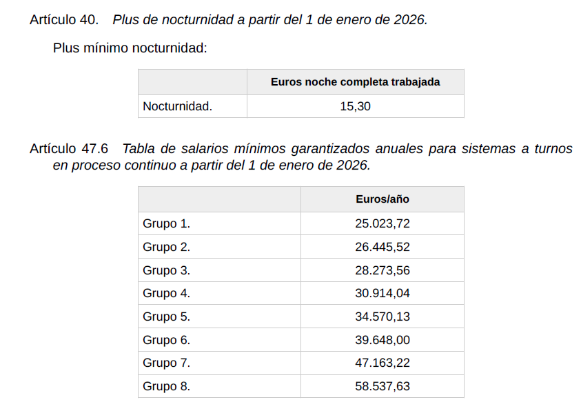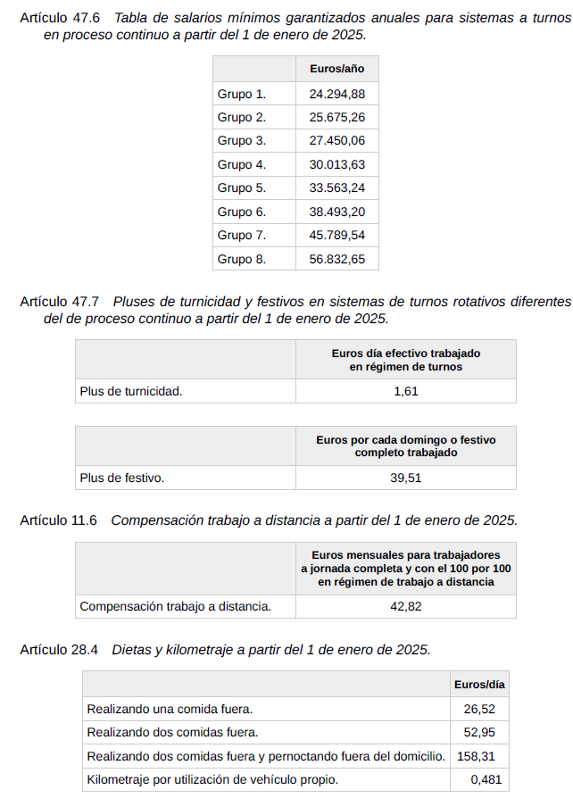 Igualmente se confirman para el año 2025 las tablas de Salarios Mínimos Garantizados de los artículos 32 y 44 del convenio, así como el plus de nocturnidad del artículo 40, los pluses de turnicidad y festivos del artículo 44.7, la compensación de trabajo a distancia del artículo 11 y los valores de dietas y kilometraje del artículo 28.4, establecidos todos ellos en el texto del XXI Convenio General de la Industria Química.