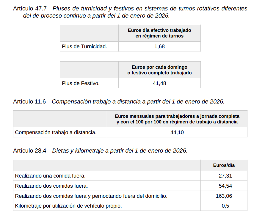 Igualmente se confirman para el año 2024 las tablas de salarios mínimos garantizados de los artículos 32 y 44 del convenio, así como el plus de nocturnidad del artículo 40, los pluses de turnicidad y festivos del artículo 44.7, la compensación de trabajo a distancia del artículo 11 y los valores de dietas y kilometraje del artículo 28.4, establecidos todos ellos en el texto del XXI Convenio General de la Industria Química.