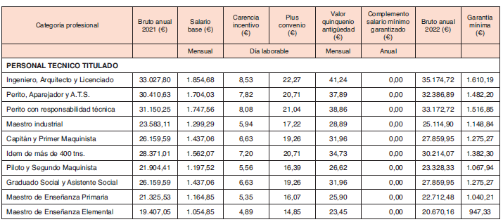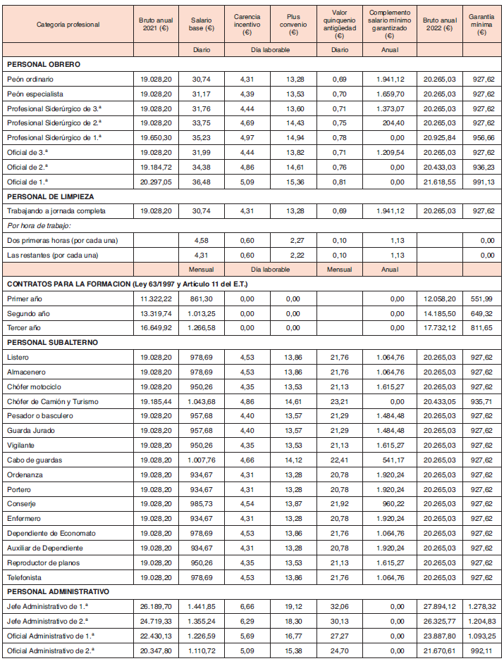 – Incremento salarial 2022: Subida fija del 6,5 sobre las tablas salariales del 2021, con efectos desde el 1 de enero de 2022.