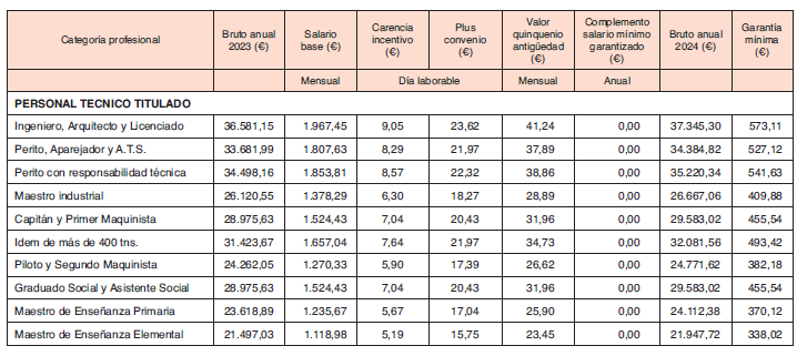 – Incremento salarial 2024: Subida fija del 2% sobre las tablas salariales de 2023, con efectos desde el 1 de enero de 2024.