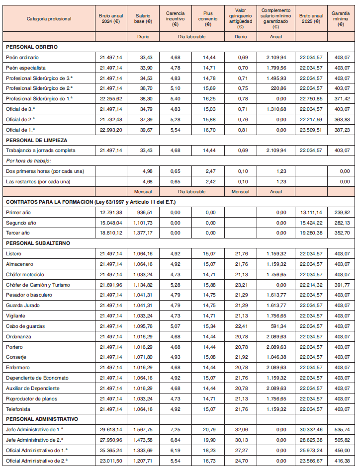 CONVENIO DE LA INDUSTRIA SIDEROMETALÚRGICA DE BIZKAIA 2022-2025. TABLAS 2025.