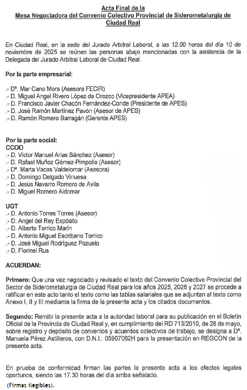 CONVENIO COLECTIVO DE ÁMBITO PROVINCIAL PARA EL SECTOR DE LA INDUSTRIA, LA TECNOLOGÍA Y LOS SERVICIOS DEL SECTOR DEL METAL DE CIUDAD REAL PARA LOS AÑOS 2025-2026-2027.