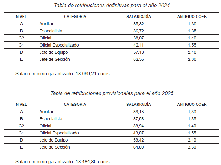 Las tablas salariales para el año 2025 se incrementarán en el 2% con efectos del 1 de enero de dicho año. A dicha cifra habrá que añadir la revisión salarial si la hubiere correspondiente al año anterior.
