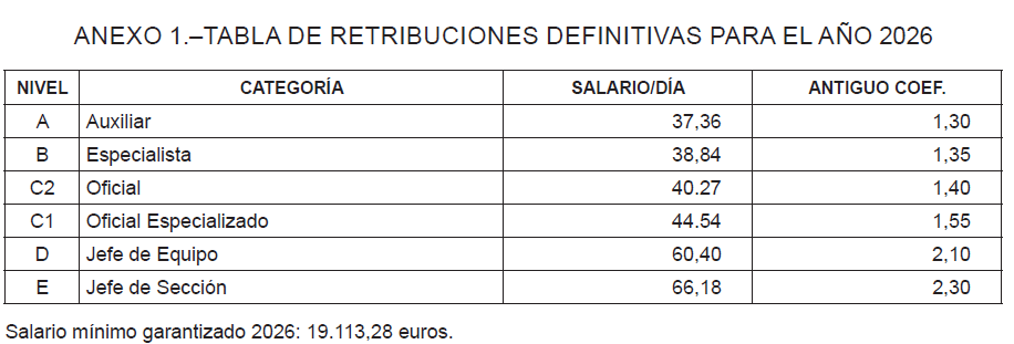 Las tablas salariales para el año 2026 se incrementarán en el 2% con efectos del 1 de enero de dicho año. A dicha cifra habrá que añadir la revisión salarial si la hubiere correspondiente al año anterior.