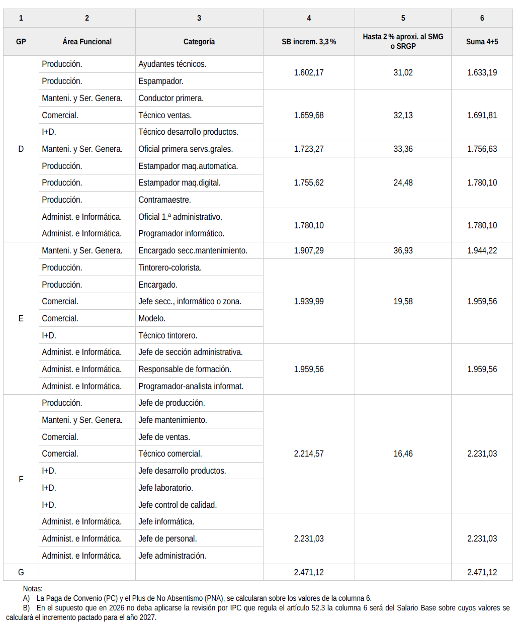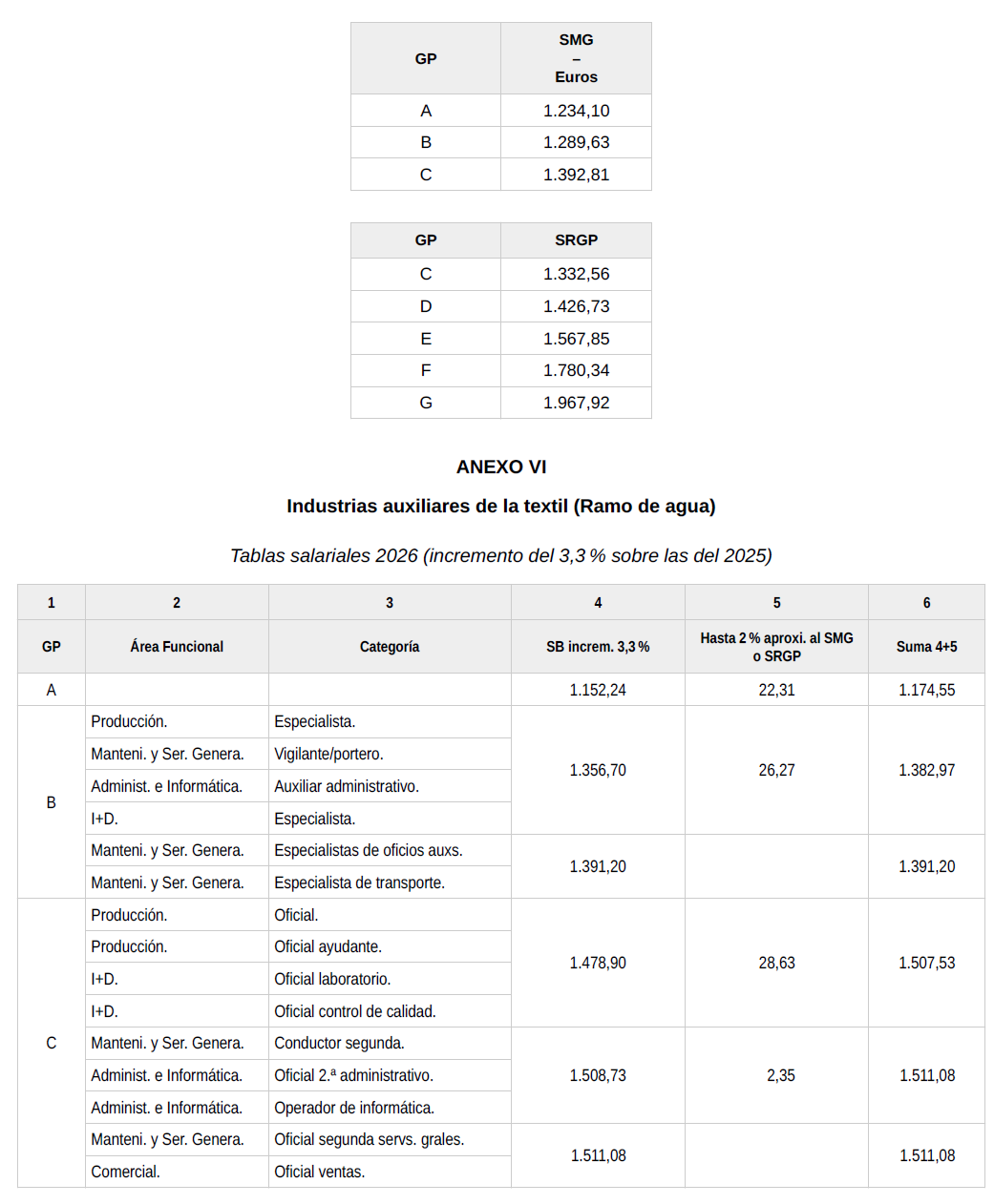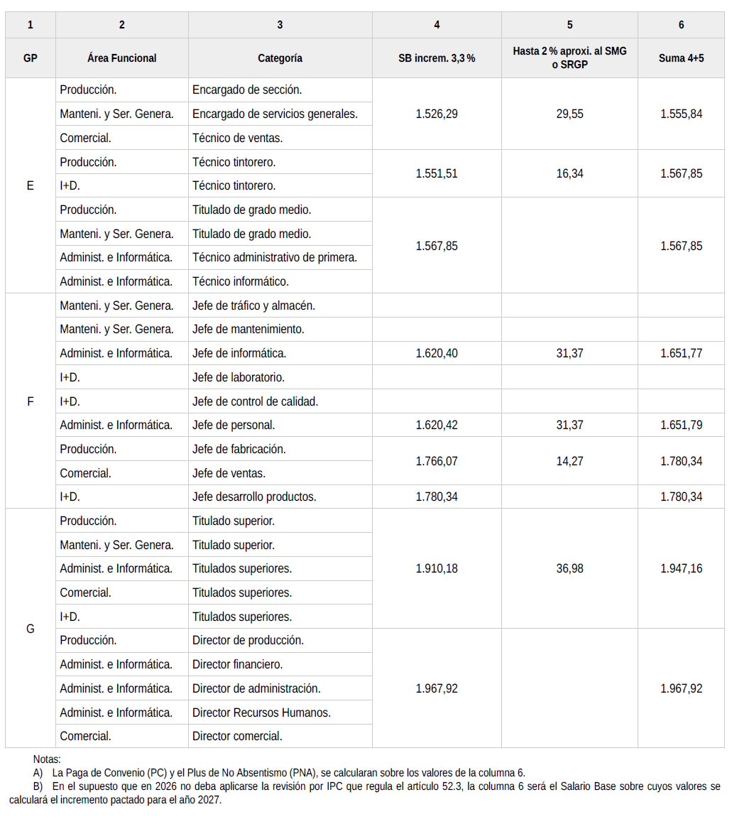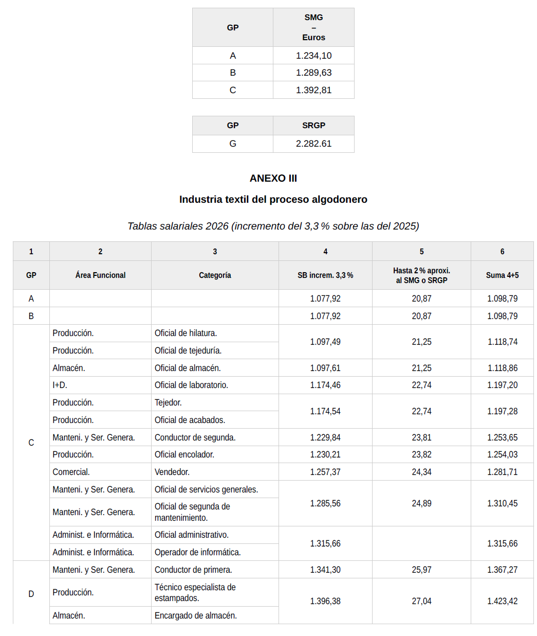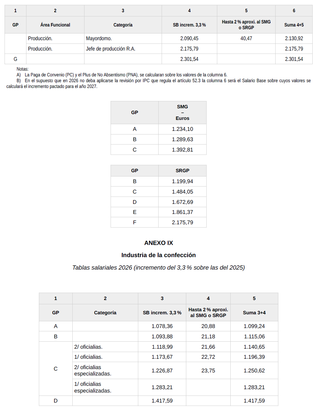 1. Conforme a lo dispuesto en los artículos 52 y 53 del Convenio colectivo general de trabajo de la industria textil y de la confección, años 2024 a 2026, publicado por Resolución de la Dirección General de Trabajo en el BOE de 9 de octubre de 2025, con efectos desde el 1 de enero del 2026, las tablas salariales (del 2025 que constan como anexos I a X del convenio), se incrementarán en un 3,3 por ciento.