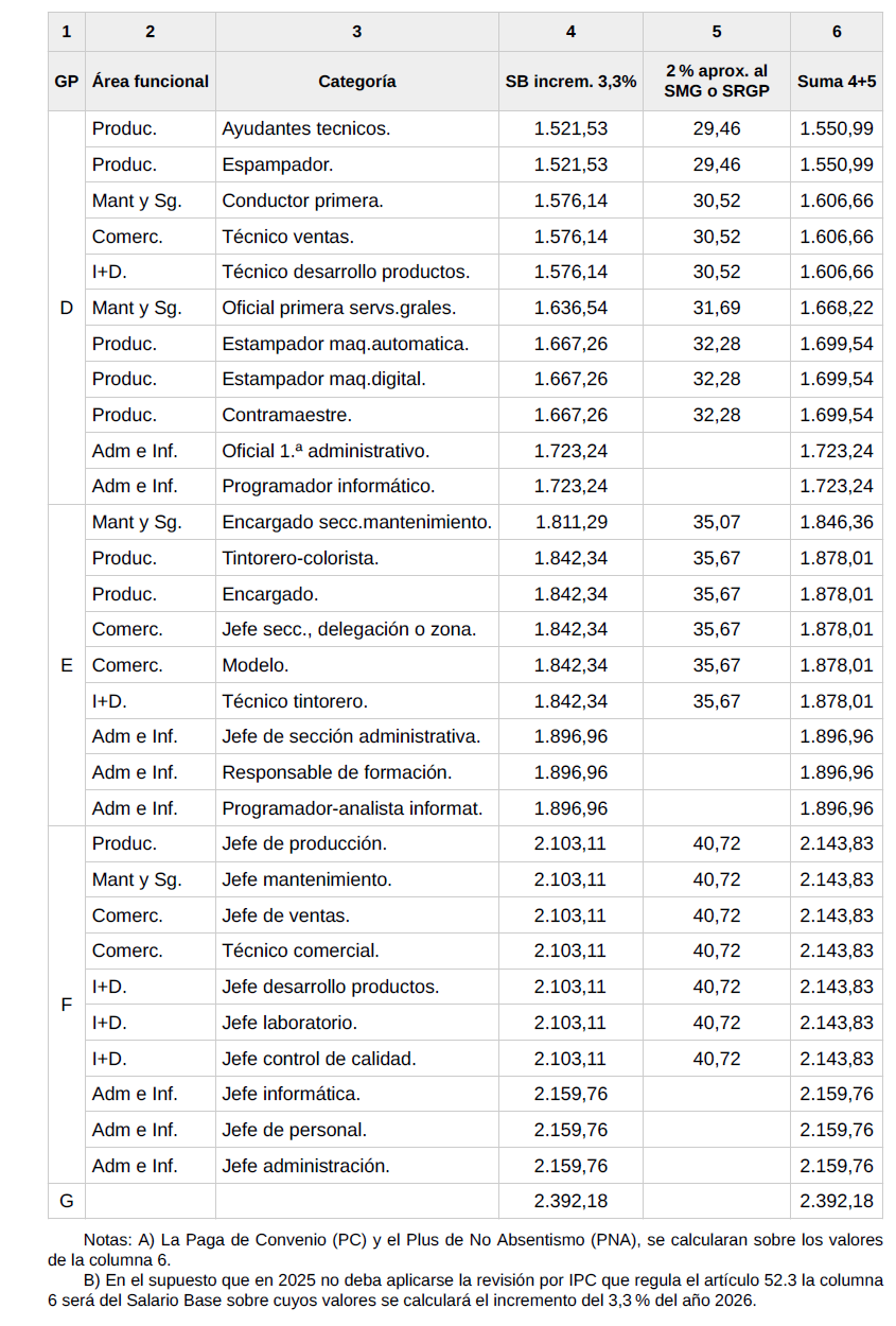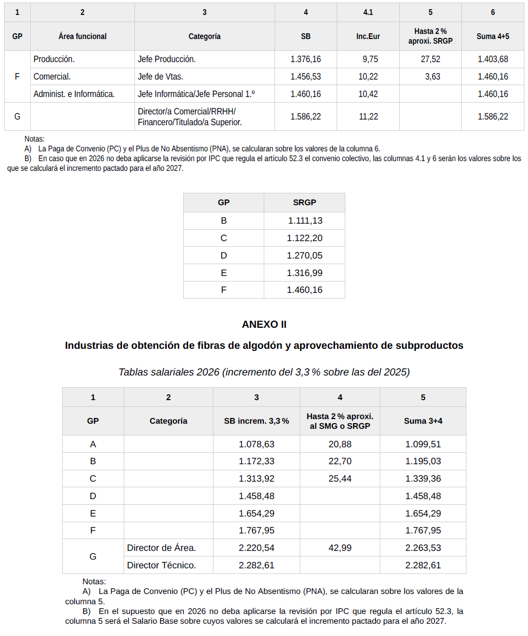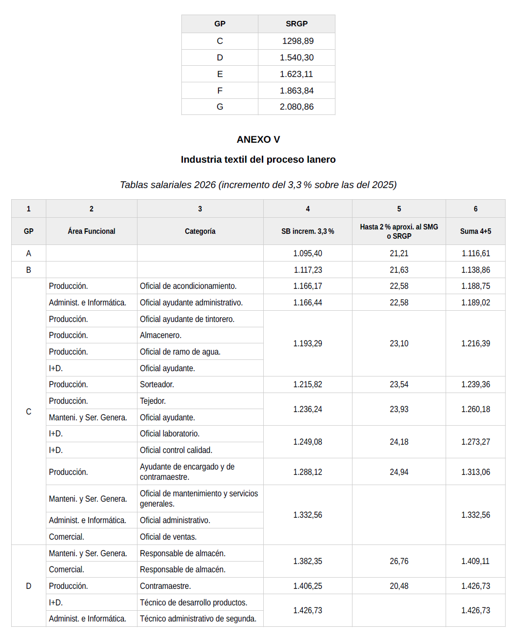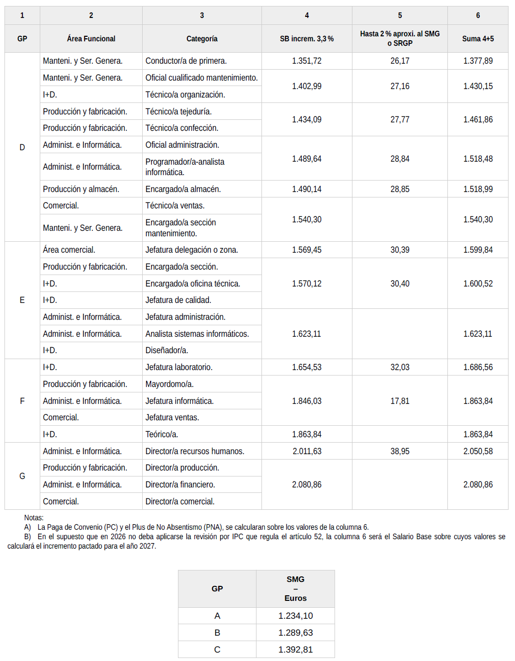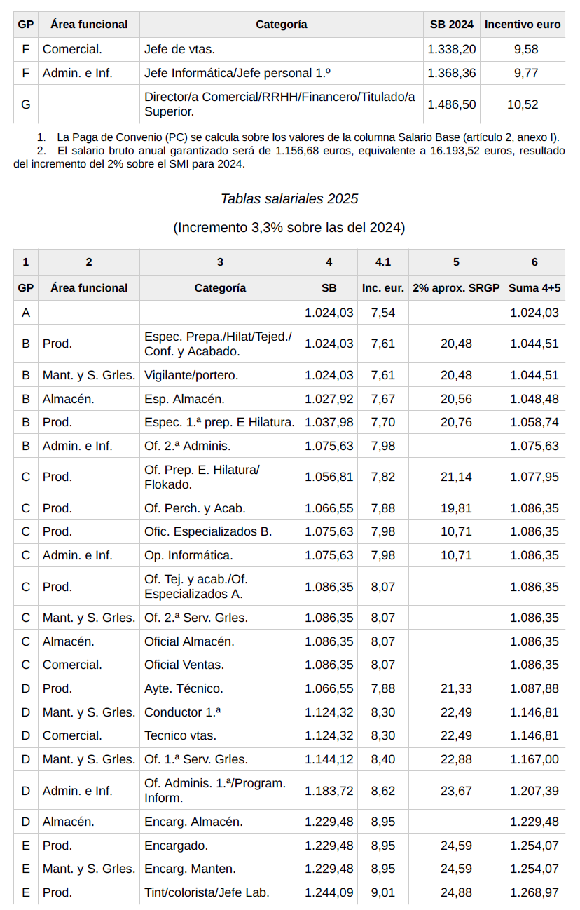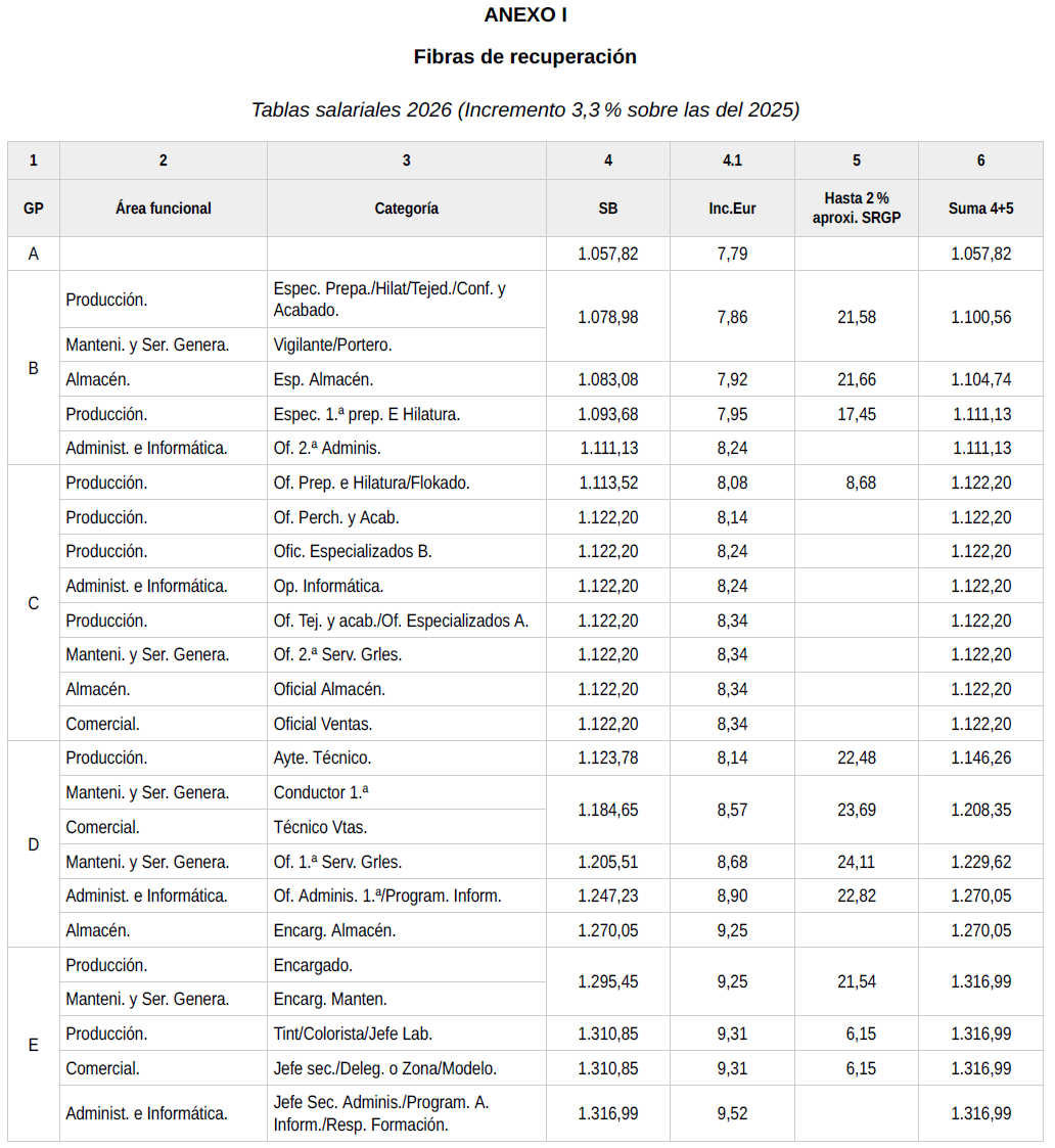 1. Conforme a lo dispuesto en los artículos 52 y 53 del Convenio colectivo general de trabajo de la industria textil y de la confección, años 2024 a 2026, publicado por Resolución de la Dirección General de Trabajo en el BOE de 9 de octubre de 2025, con efectos desde el 1 de enero del 2026, las tablas salariales (del 2025 que constan como anexos I a X del convenio), se incrementarán en un 3,3 por ciento.