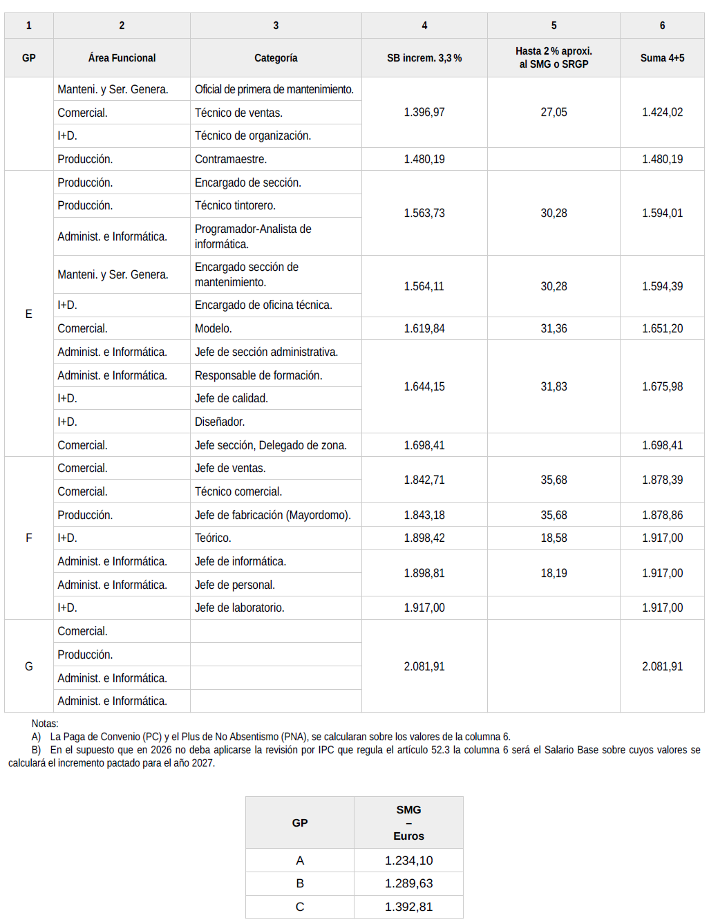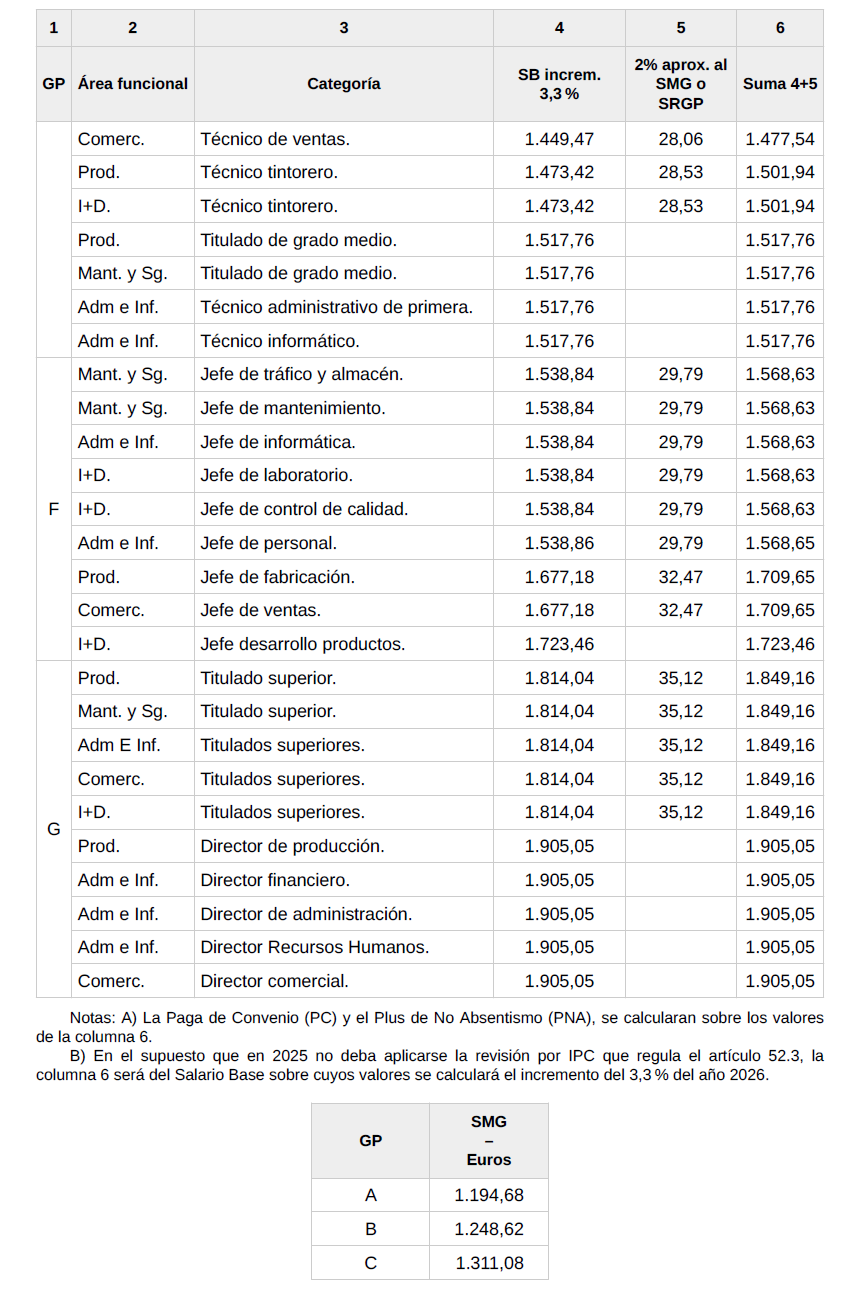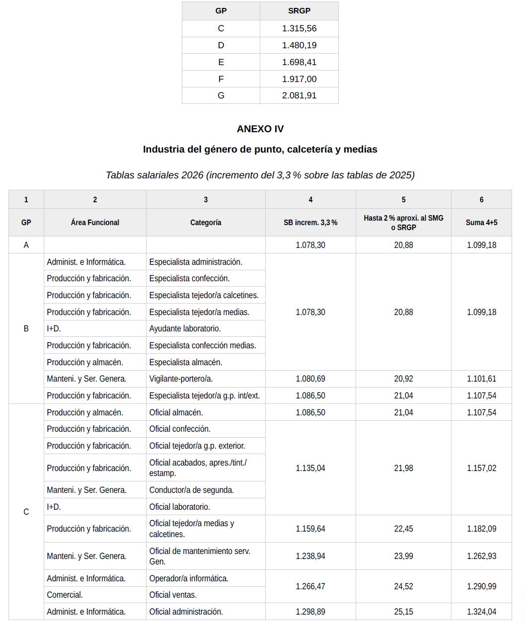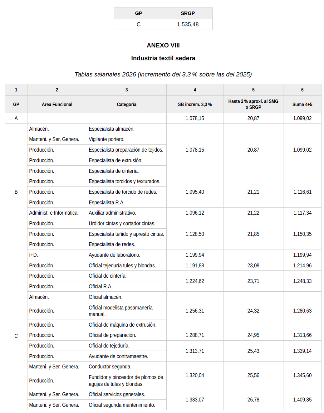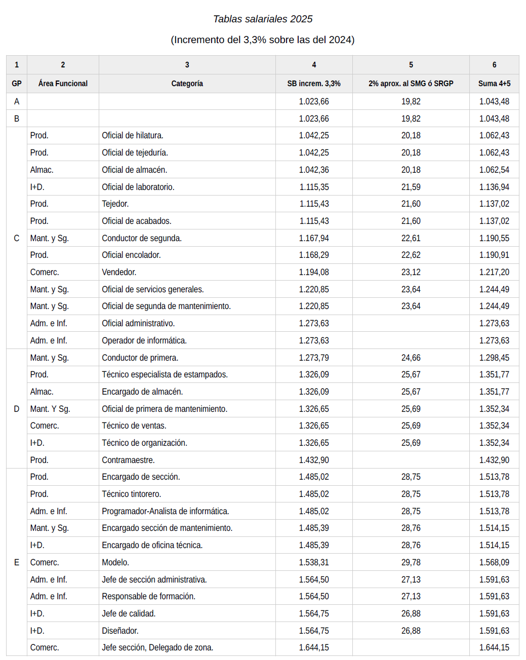1. Conforme a lo dispuesto en los artículos 52 y 53 del Convenio colectivo general de trabajo de la industria textil y de la confección, años 2024 a 2026, publicado por Resolución de la Dirección General de Trabajo en el BOE de 9 de octubre de 2025, con efectos desde el 1 de enero del 2026, las tablas salariales (del 2025 que constan como anexos I a X del convenio), se incrementarán en un 3,3 por ciento.