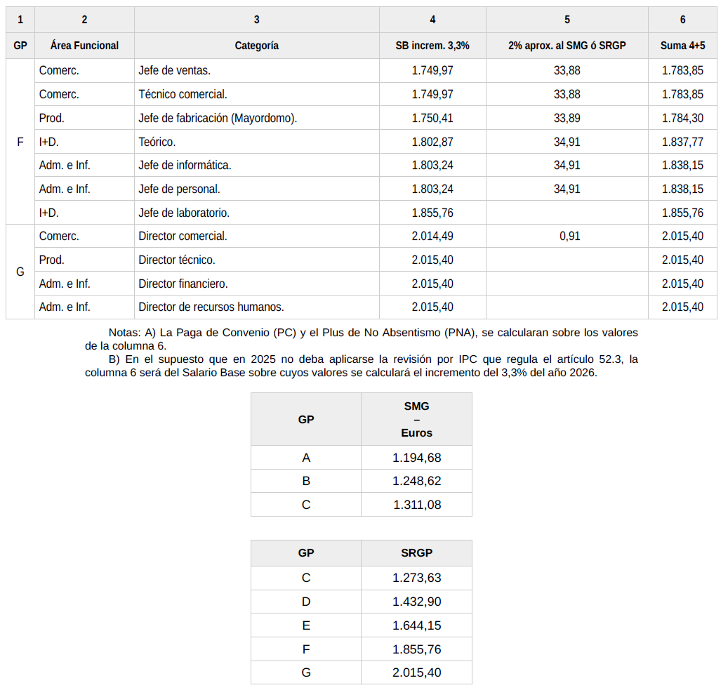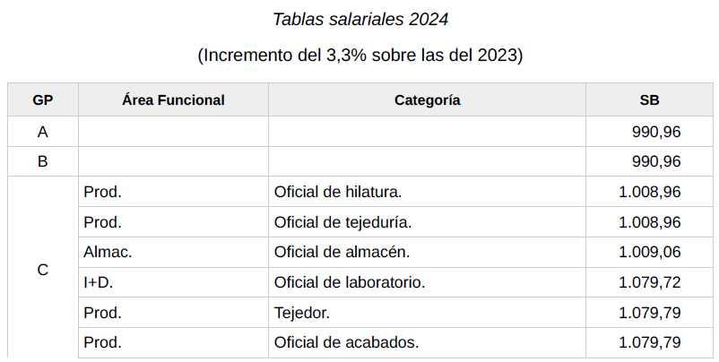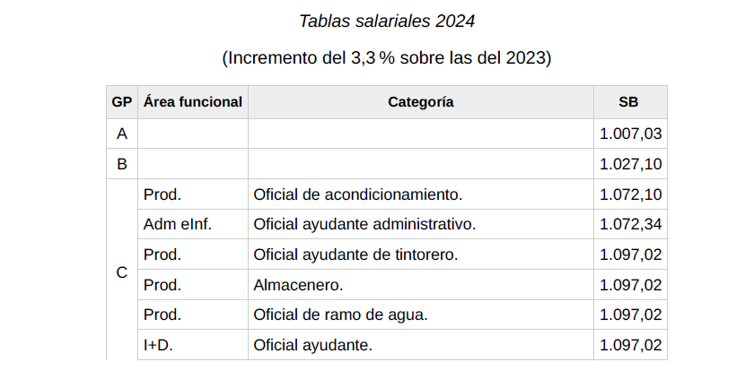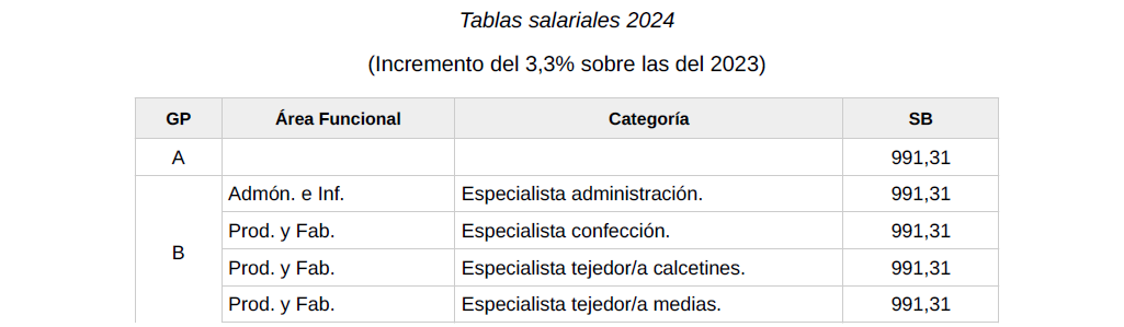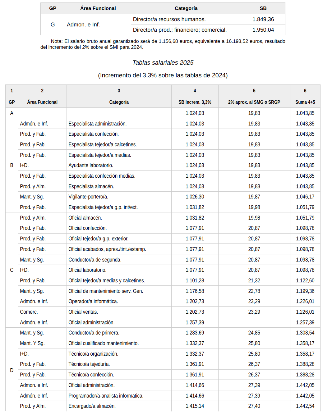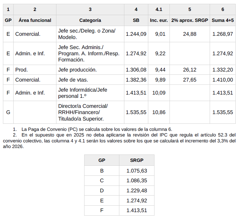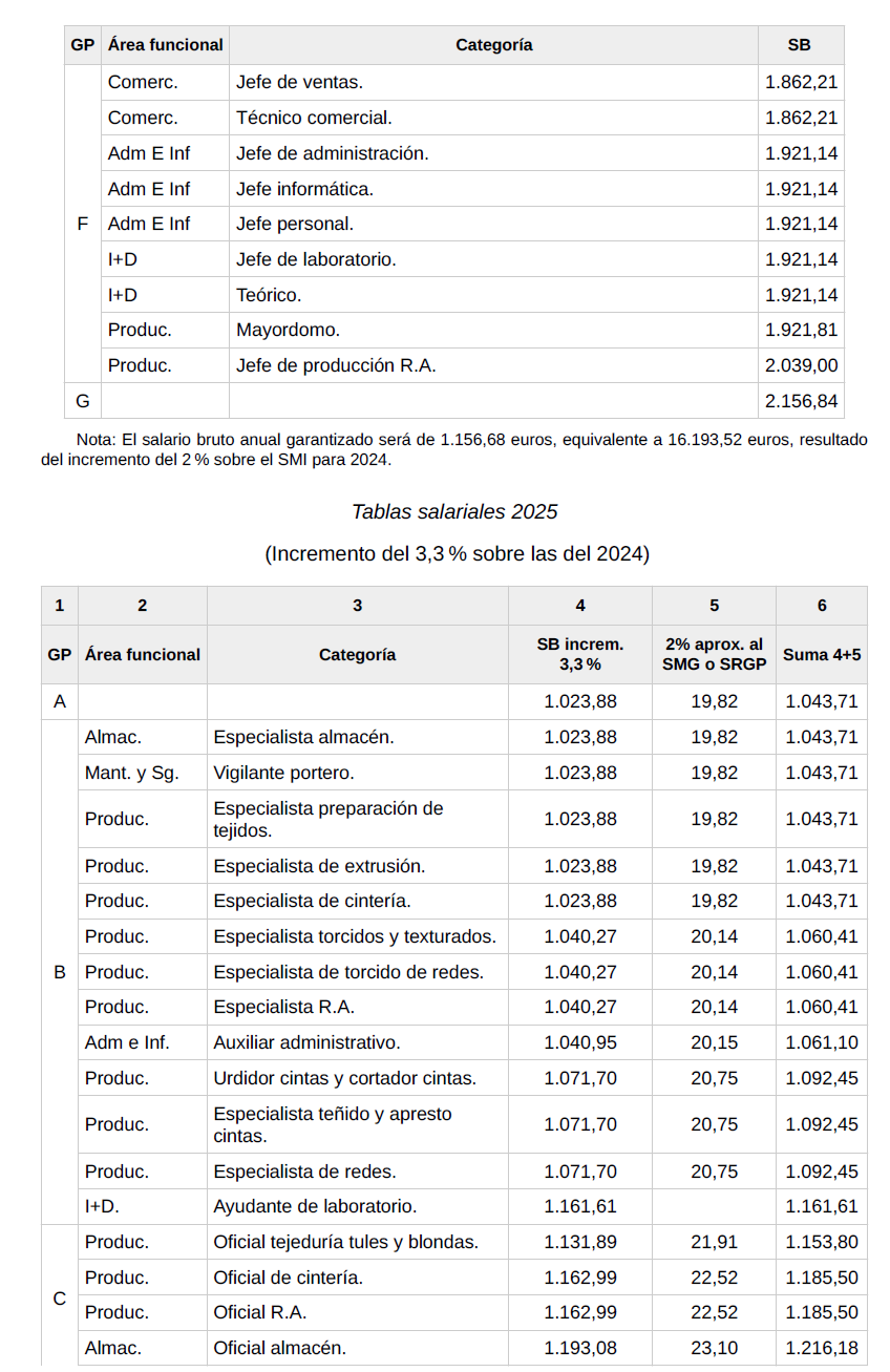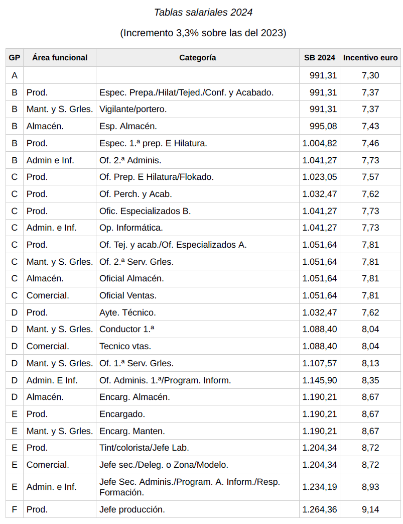 1. Conforme a lo dispuesto en los artículos 52 y 53 del Convenio colectivo general de trabajo de la industria textil y de la confección, años 2024 a 2026, publicado por Resolución de la Dirección General de Trabajo en el BOE de 9 de octubre de 2025, con efectos desde el 1 de enero del 2026, las tablas salariales (del 2025 que constan como anexos I a X del convenio), se incrementarán en un 3,3 por ciento.
