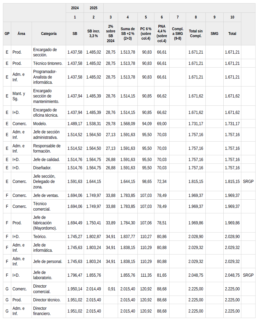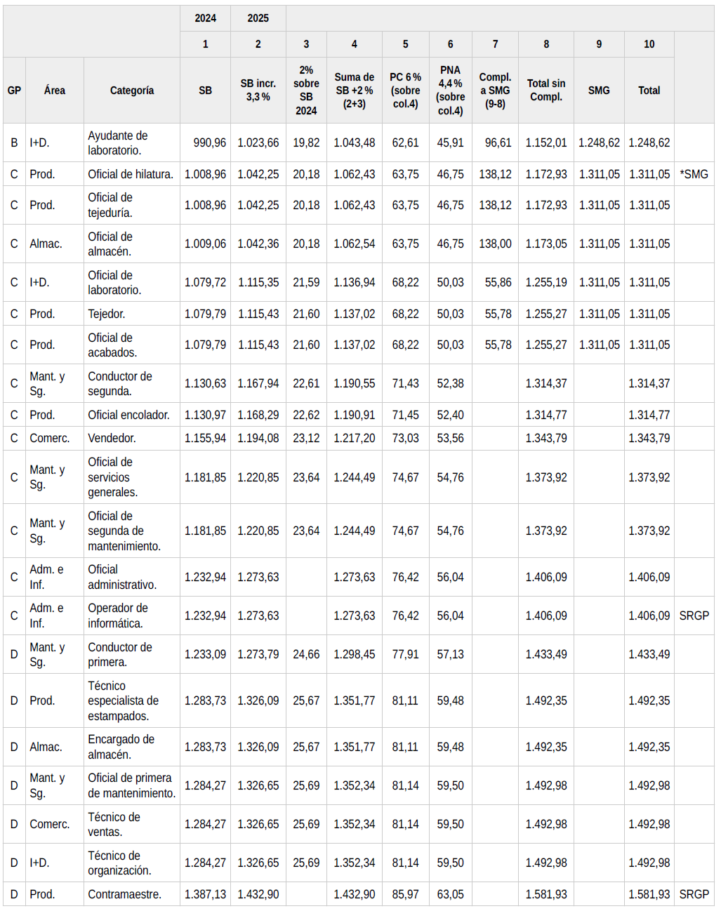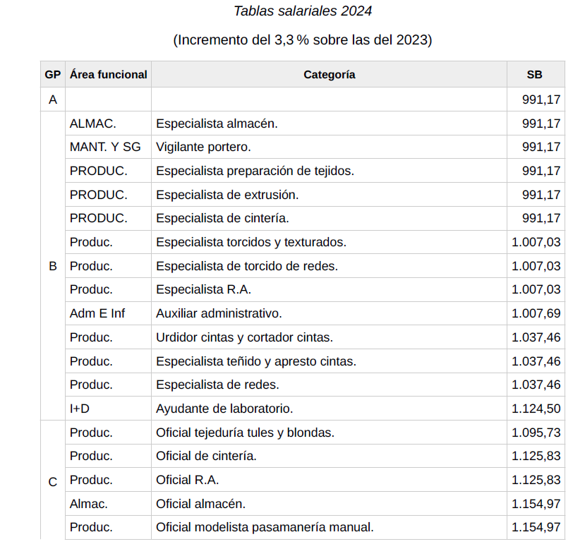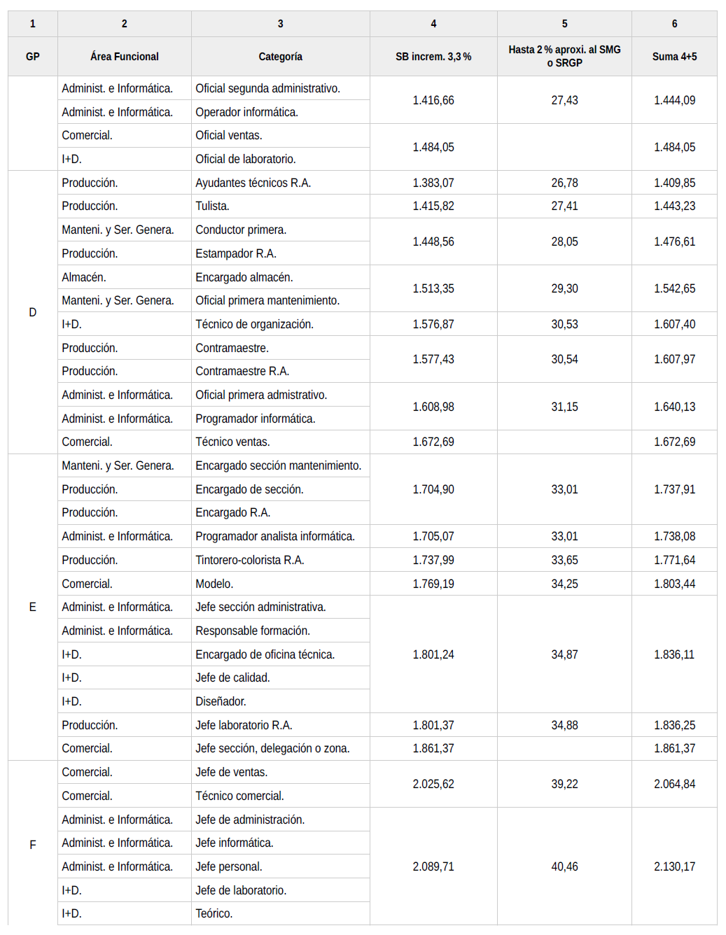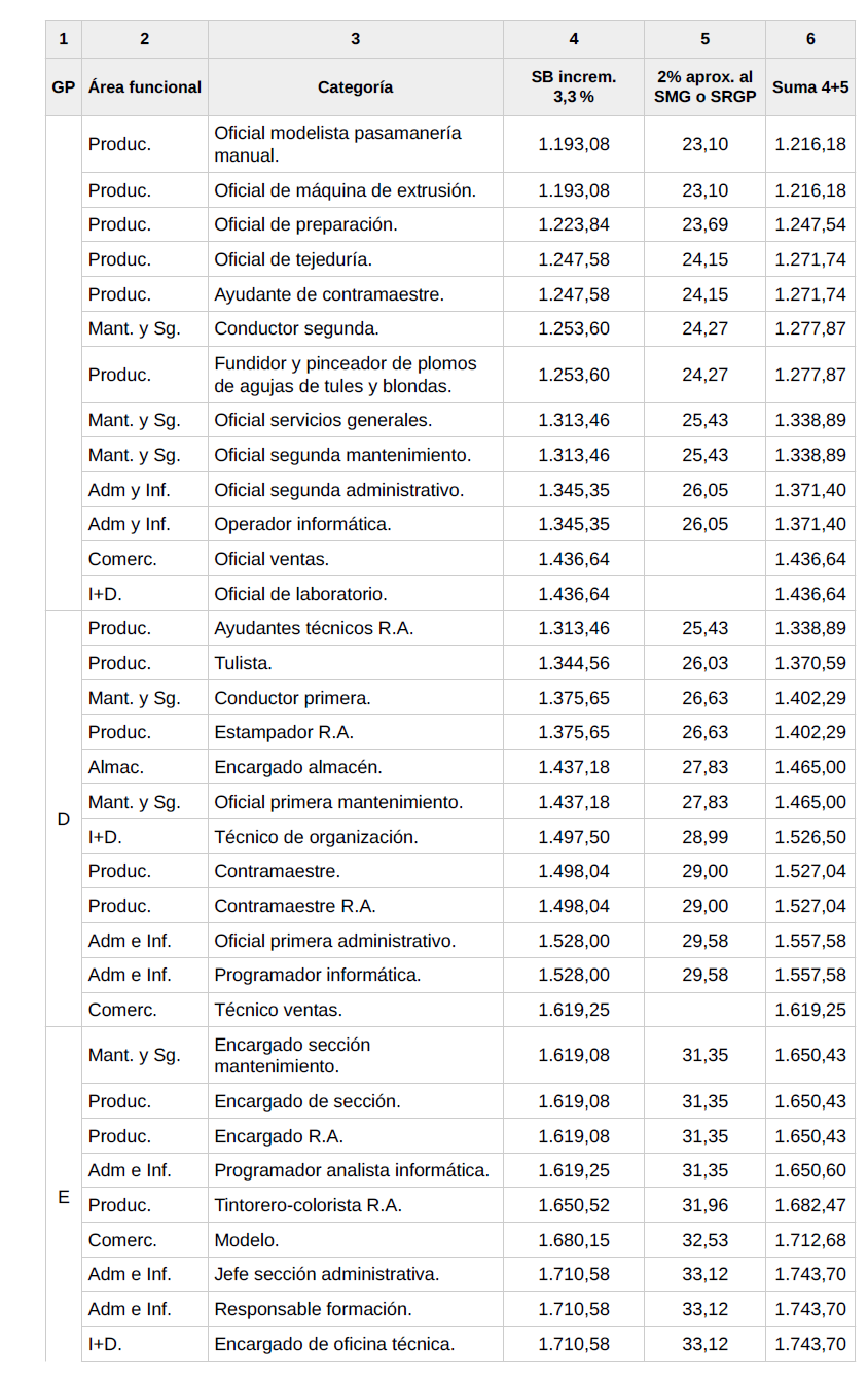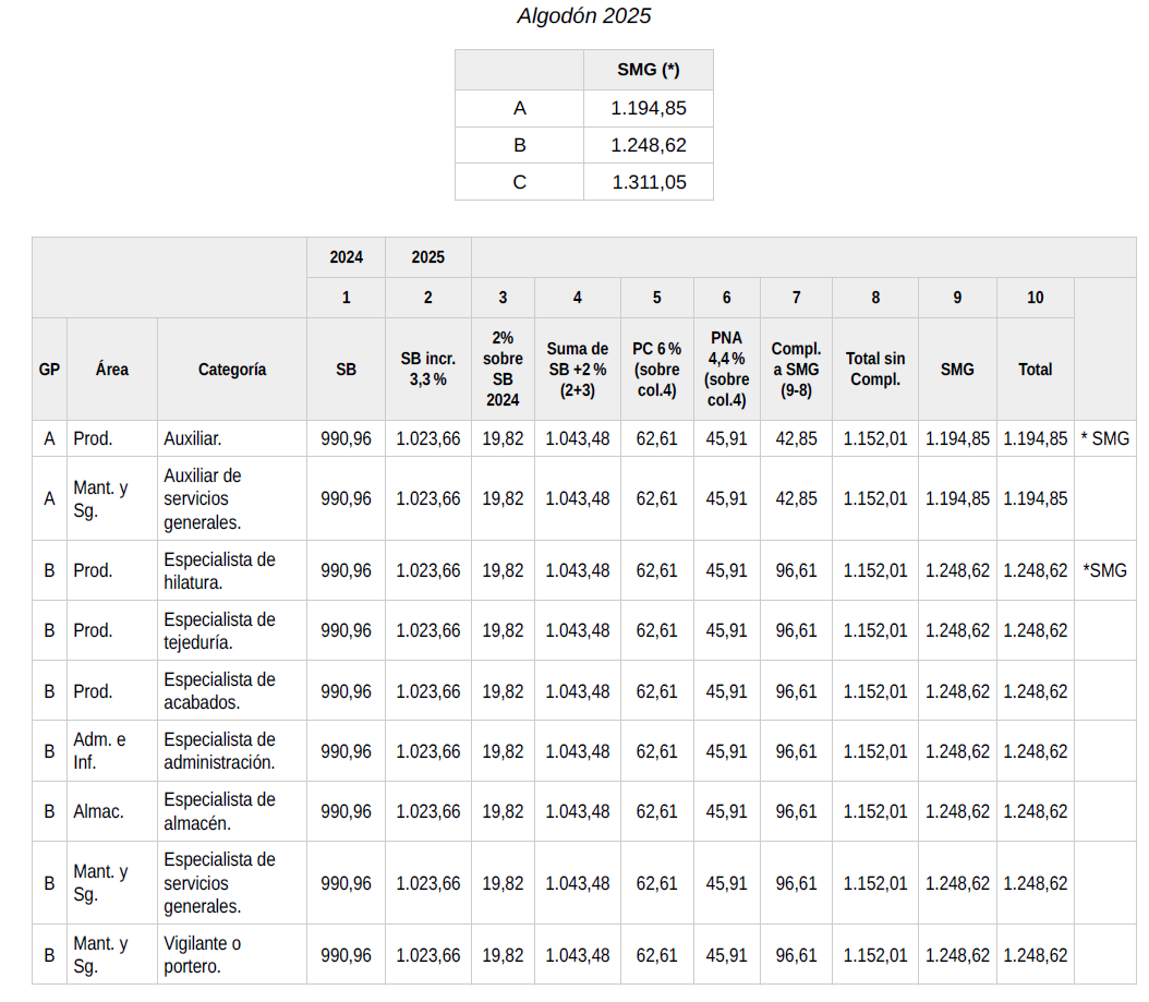 1. Conforme a lo dispuesto en los artículos 52 y 53 del Convenio colectivo general de trabajo de la industria textil y de la confección, años 2024 a 2026, publicado por Resolución de la Dirección General de Trabajo en el BOE de 9 de octubre de 2025, con efectos desde el 1 de enero del 2026, las tablas salariales (del 2025 que constan como anexos I a X del convenio), se incrementarán en un 3,3 por ciento.