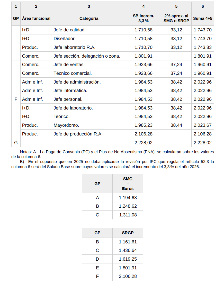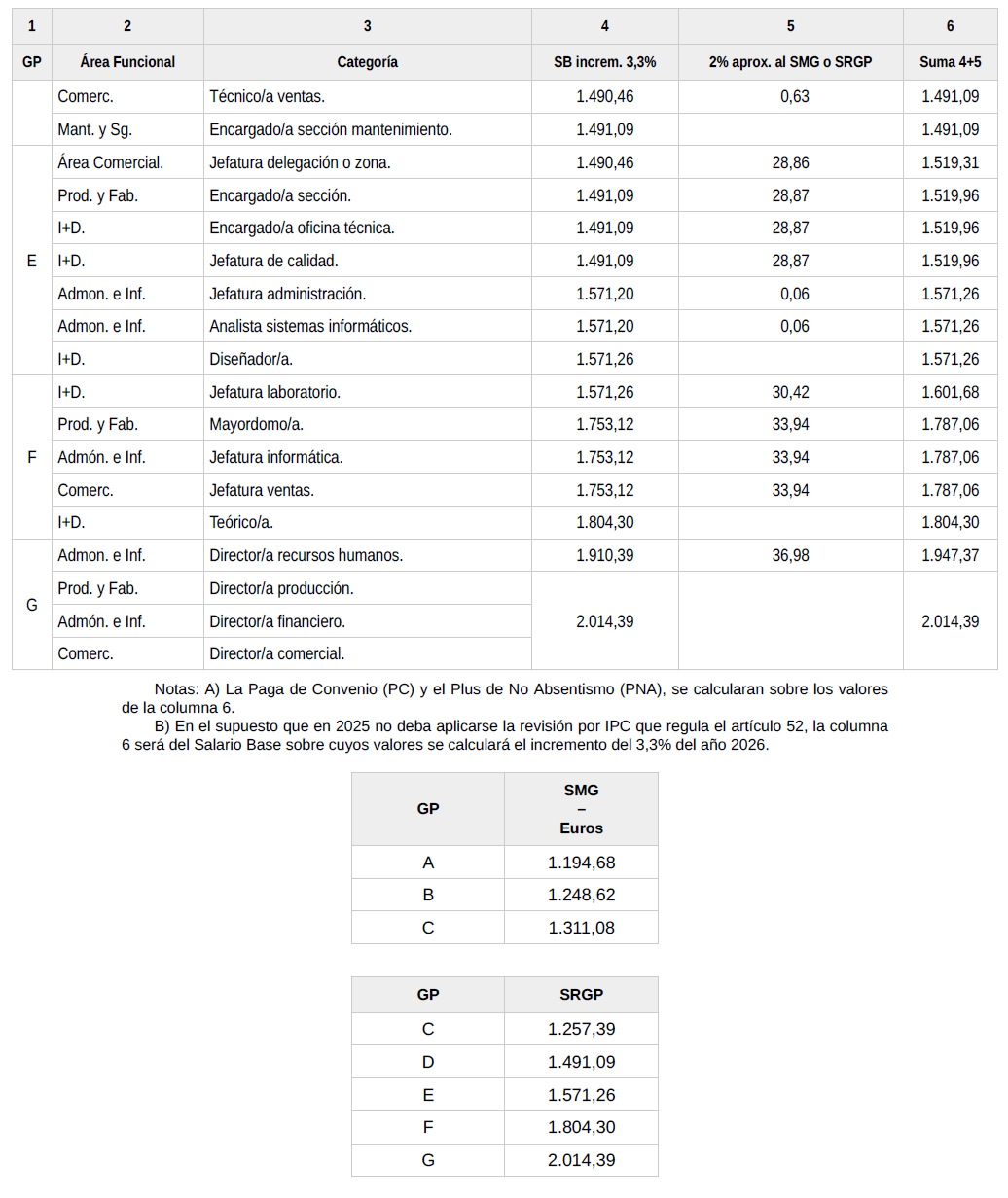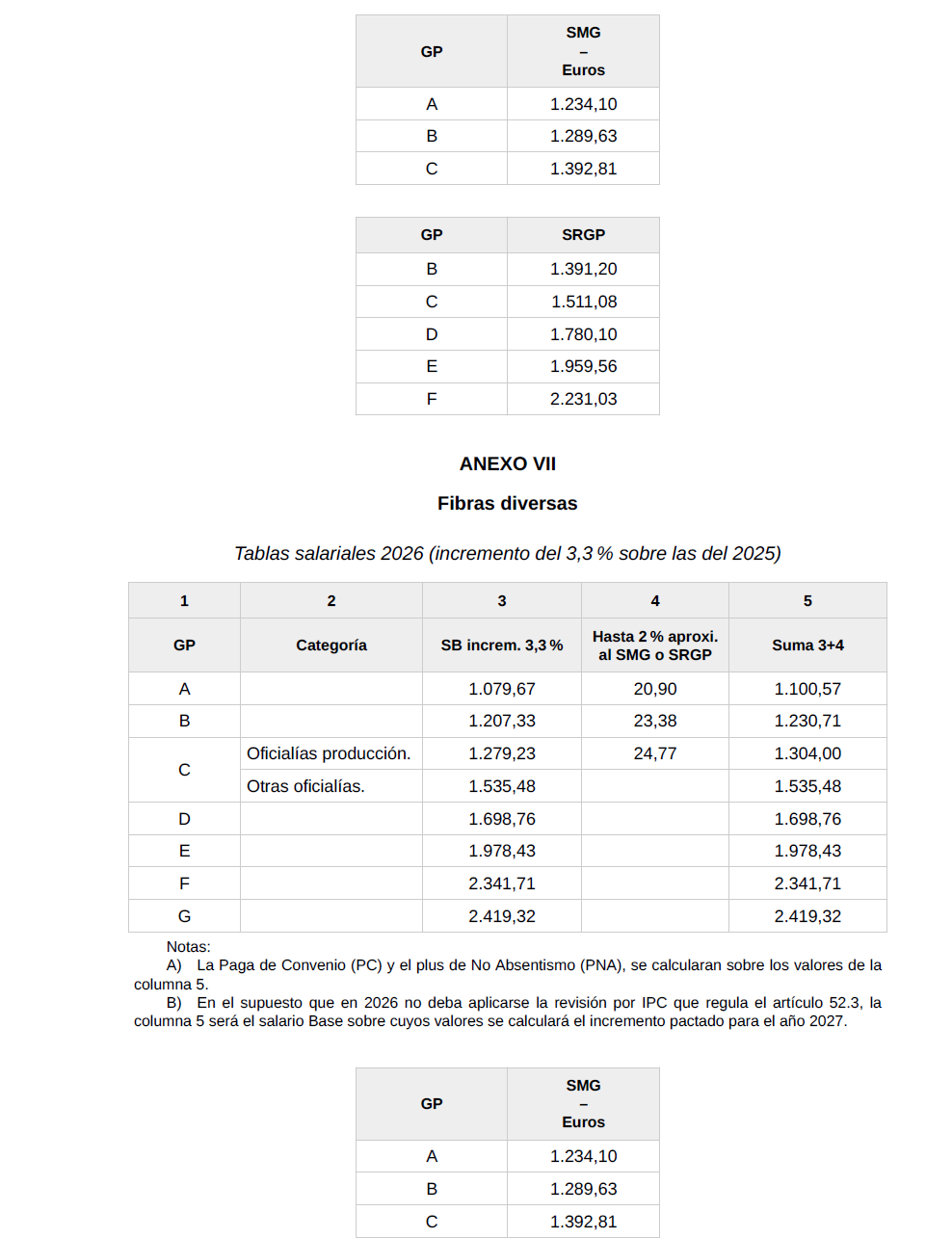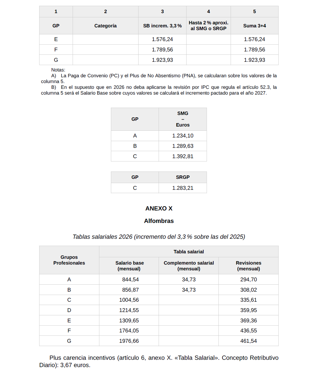 Se adjuntan a la presente acta, formando parte de la misma, las tablas salariales para el 2026 correspondientes a los diez anexos subsectoriales que configuran el presente convenio colectivo.