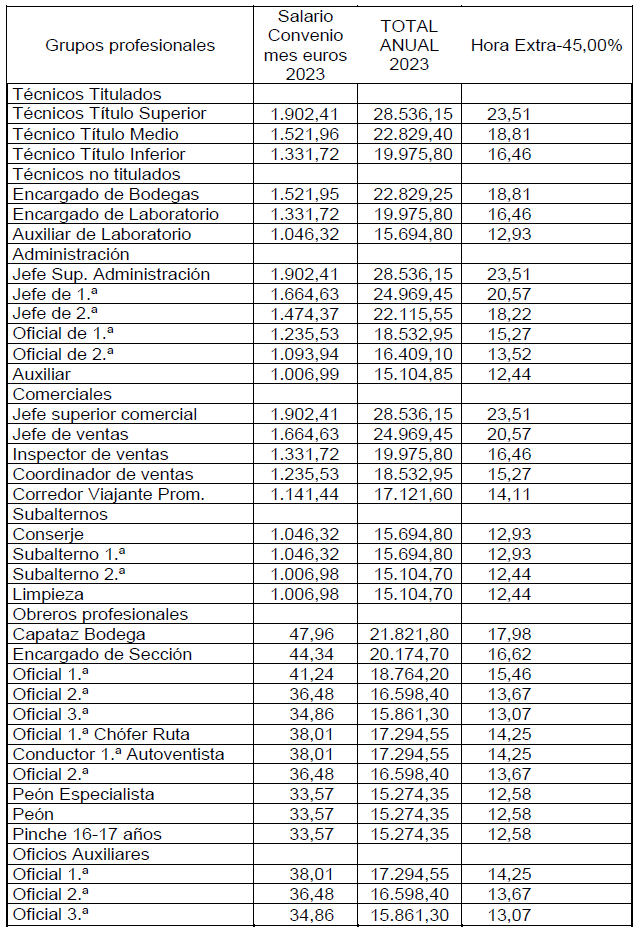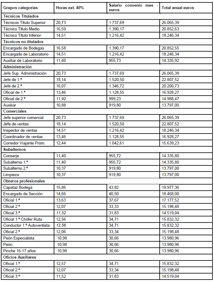 El salario anual para las categorías reseñadas del Convenio Colectivo de la Industria y el Comercio de la Vid es de 1.008,00 € en 15 pagas (15.120€ anuales), salario anual que con las pagas prorrateadas sería 1260,00€ mensuales.