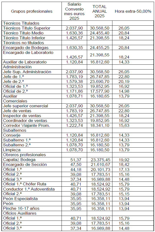 El Convenio Colectivo de la Industria y el Comercio de la Vid para la provincia de Valladolid tiene 15 pagas, con lo que hay que comprobar si el cómputo anual establecido en el convenio colectivo para los distintos grupos profesionales es inferior al SMI anual para el año 2025 (16.576,00€).