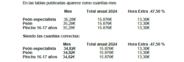 En las tablas publicadas el 10-5-2024 en el BOP de Valladolid donde se procedía a la actualización salarial de los grupos profesionales que con la publicación del SMI para el año 2024 habían quedado por debajo de la cuantía anual establecida SE HA DETECTADO ERRORES EN LAS CATEGORÍAS DE PEÓN ESPECIALISTA, PEÓN, PINCHE 16-17 AÑOS.