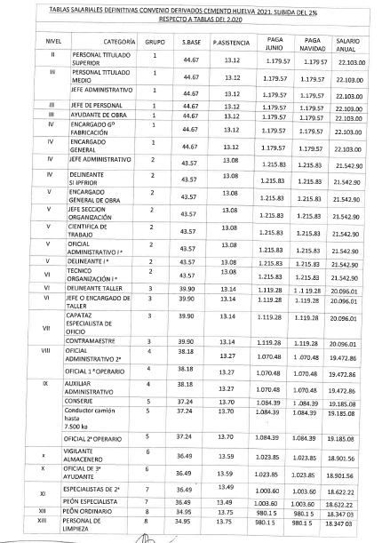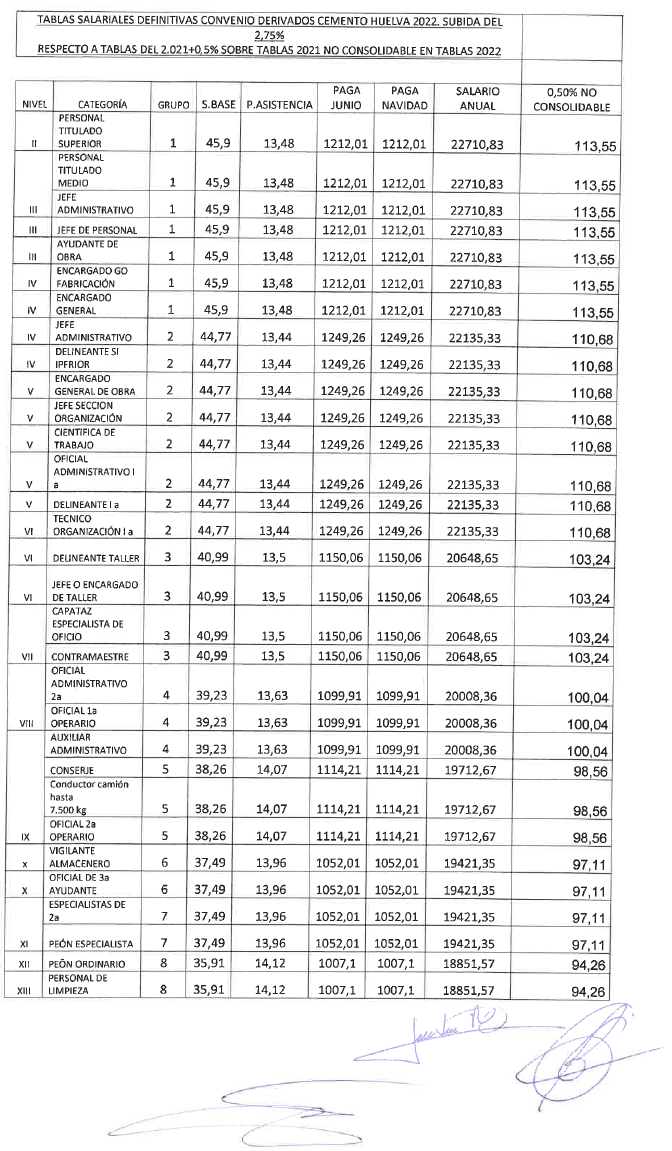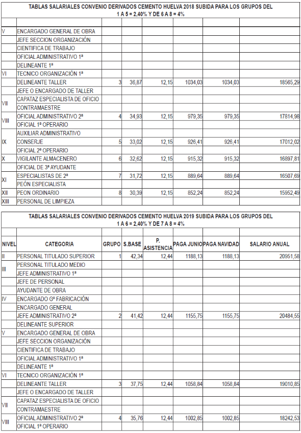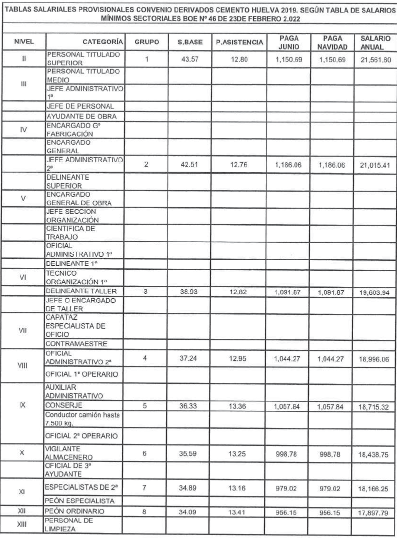 Que habiendo llegado las partes a un acuerdo una vez conocido la evolución del consumo de cemento publicada por el INE, y suscritas las Tablas Salariales del Convenio General del Sector de Derivados del Cemento, publicadas por Resolución de 11 de febrero de 2022 (BOE de 23/02/2022), éstas suscriben las Tablas Salariales del Convenio Colectivo para las Industrias de Derivados del Cemento de la Provincia de Huelva con vigencia para los años 2019, 2020 y 2021.
