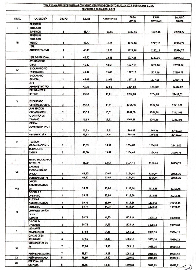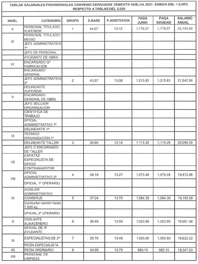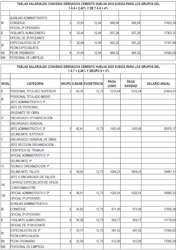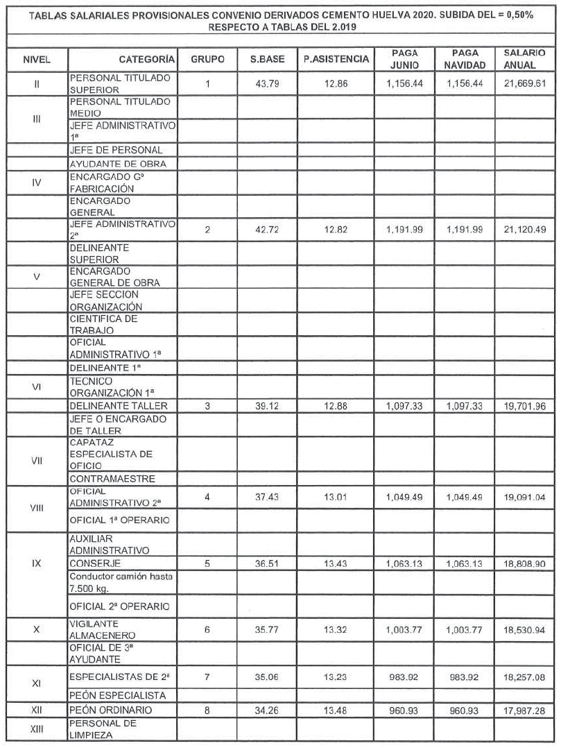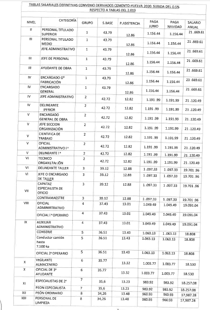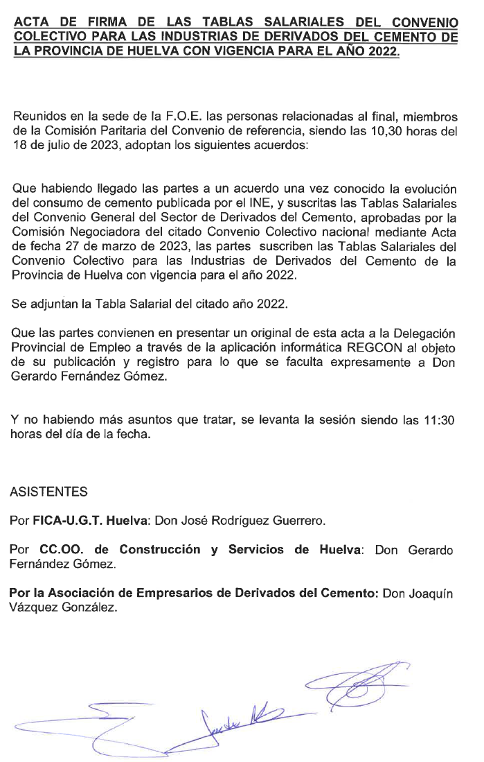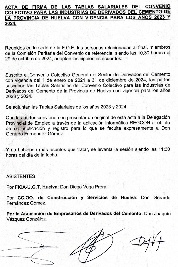 ACTA DE FIRMA DE LAS TABLAS SALARIALES DEL CONVENIO COLECTIVO PARA LAS INDUSTRIAS DE DERIVADOS DEL CEMENTO DE LA PROVINCIA DE HUELVA CON VIGENCIA DE LOS ANOS 2019, 2020 Y 2021.