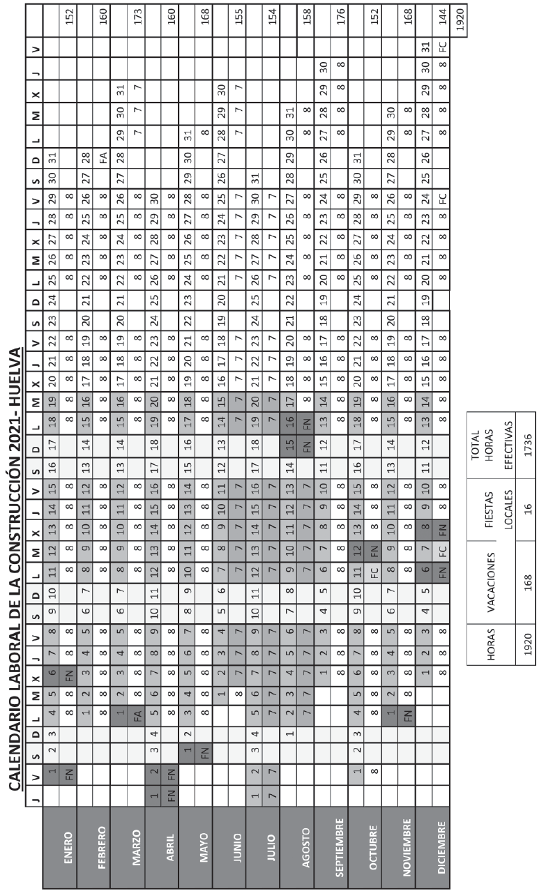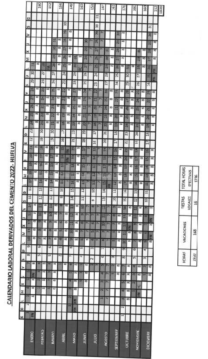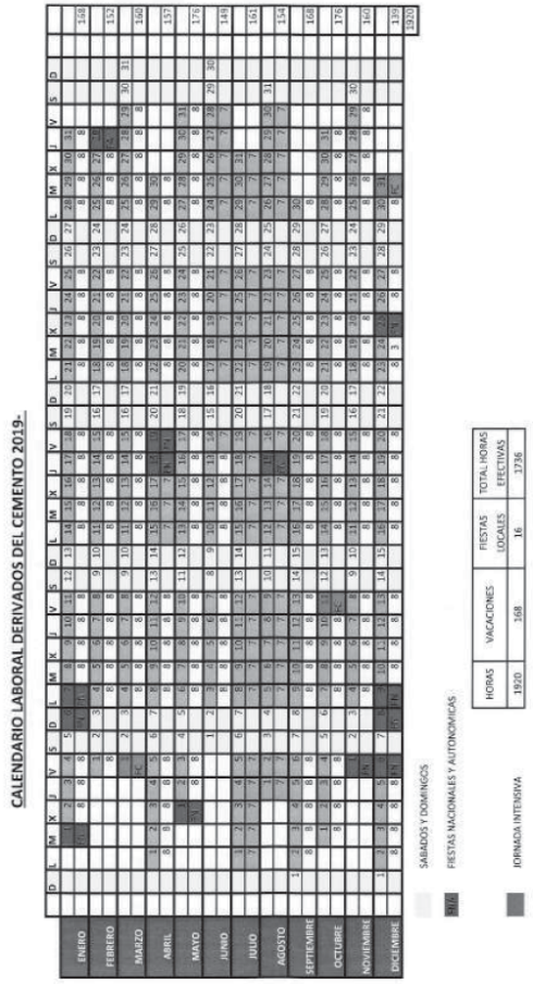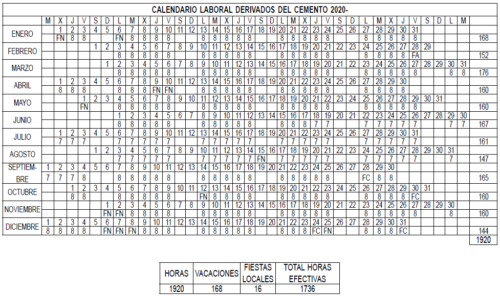 Las partes convienen en establecer el calendario del año 2022 para las Industrias de Derivados del Cemento, adecuando el número de horas de trabajo efectivo a las circunstancias del nuevo año, considerando festivos los días que constan en el calendario adjunto que se firma unido al presente acta, teniendo en cuenta, además, que la jornada anual de trabajo será de 1736 horas.