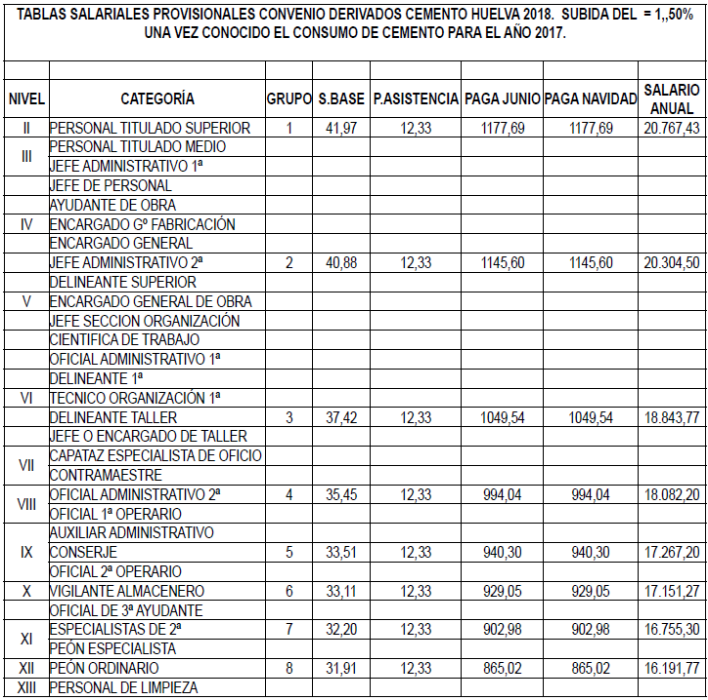 RESOLUCIÓN de la Delegación Territorial de Empleo, Formación, Trabajo Autónomo, Economía, Conocimiento, Empresas y Universidad de la Junta de Andalucía en Huelva, por la que se acuerda el registro, depósito y publicación de las TABLAS SALARIALES PARA EL AÑO 2018 DEL CONVENIO COLECTIVO DE INDUSTRIAS DE DERIVADOS DEL CEMENTO DE LA PROVINCIA DE HUELVA.