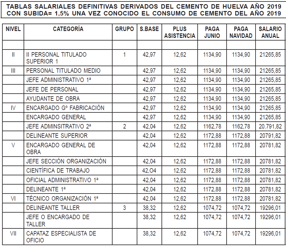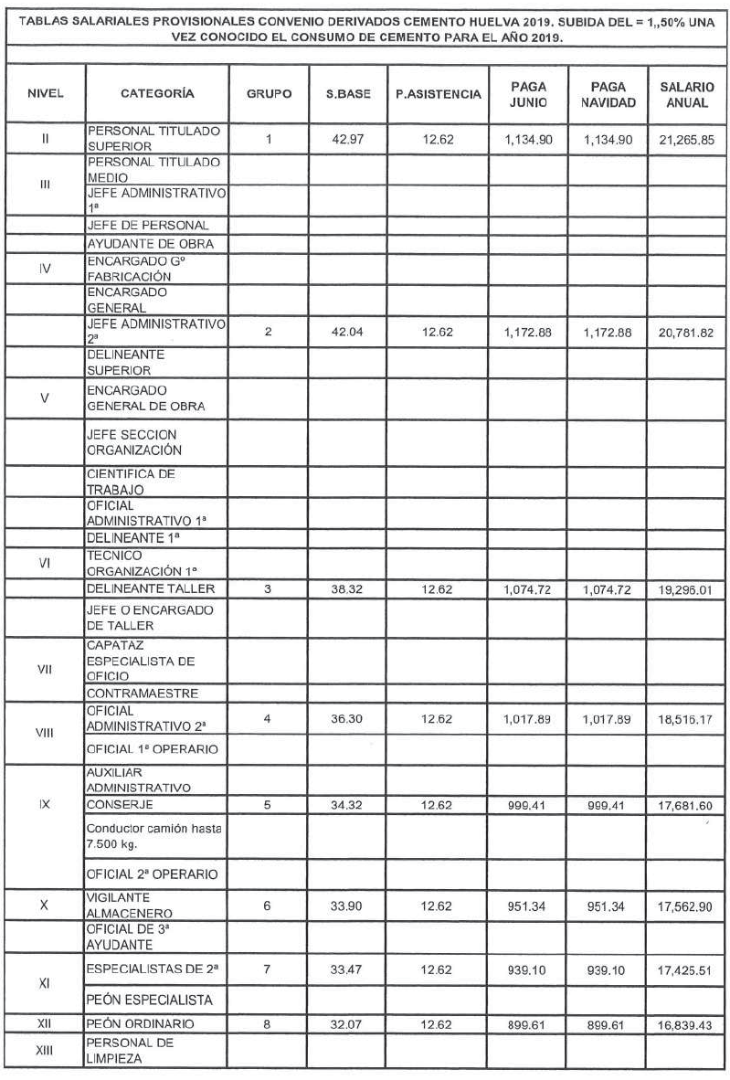 RESOLUCIÓN de la Delegación Territorial de Empleo, Formación, Trabajo Autónomo, Economía, Conocimiento, Empresas y Universidad de la Junta de Andalucía en Huelva, por ia que se acuerda el registro, depósito y publicación de las TABLAS SALARIALES PARA EL AÑO 2019 DEL CONVENIO COLECTIVO DE INDUSTRIAS DE DERIVADOS DEL CEMENTO DE LA PROVINCIA DE HUELVA.